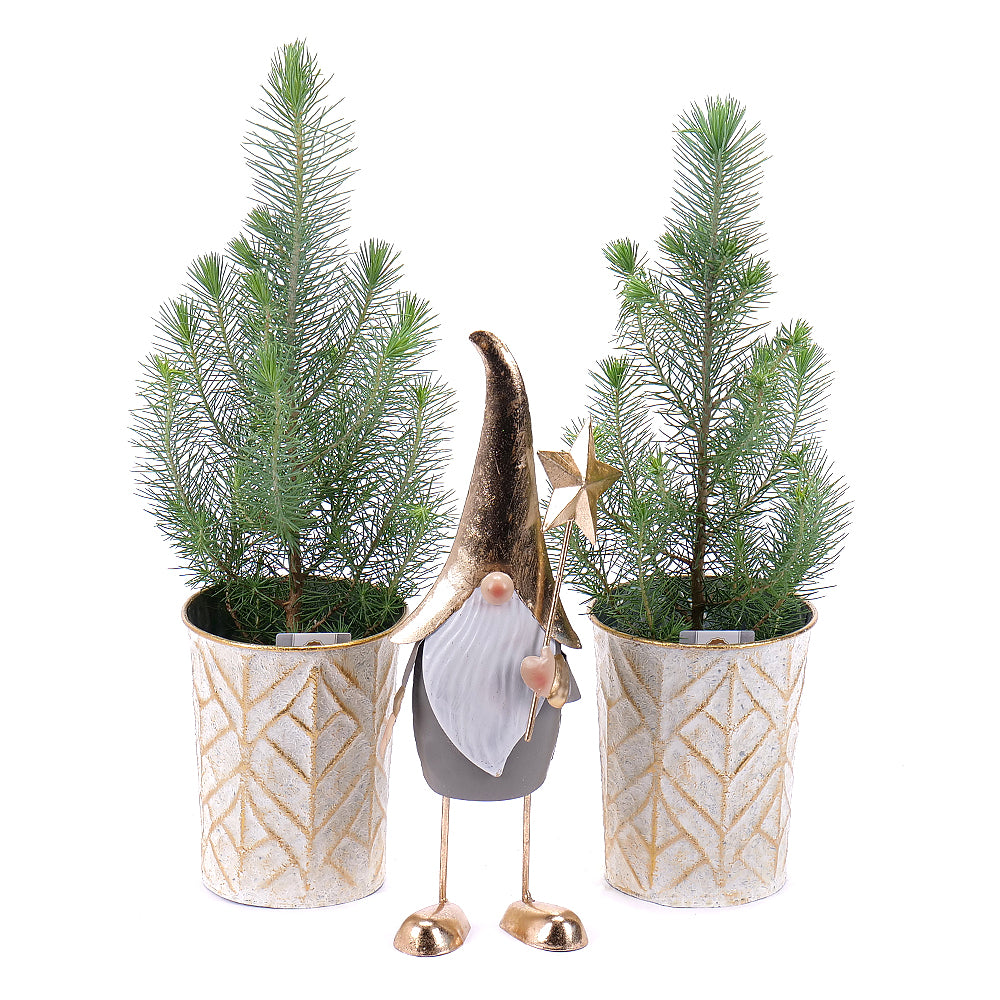 Darčekový set živých stromčekov - Pinus silver v dekoračnom plechovom obale - 2 ks s dekoračným kovovým trpaslíkom - 1 ks.