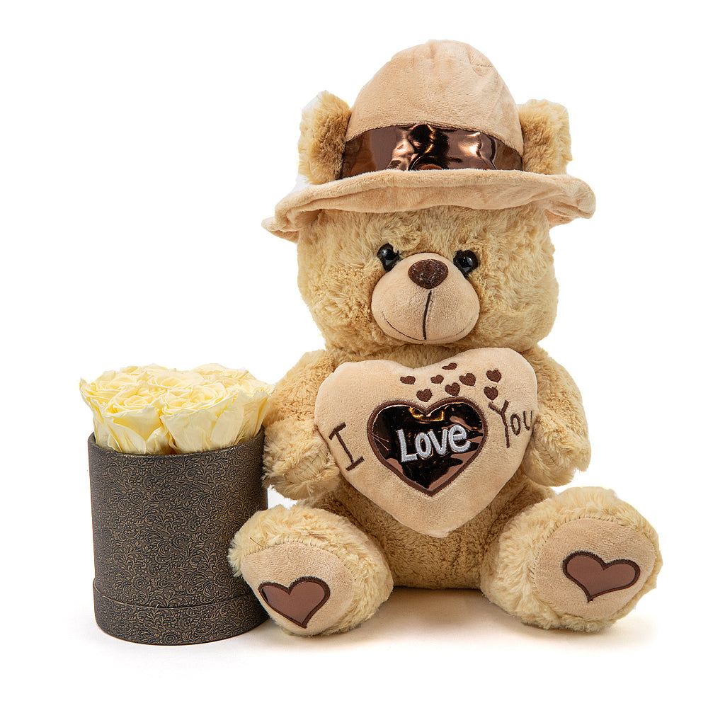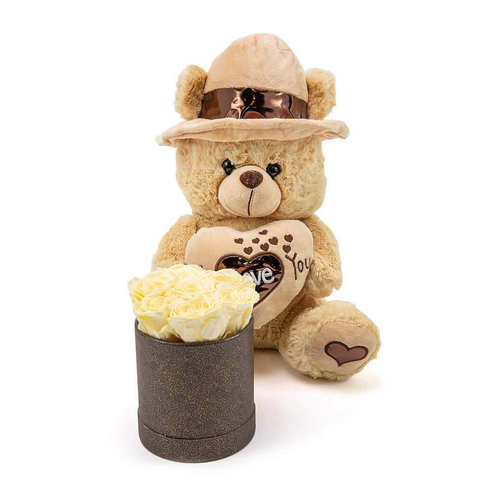 In eterno okrúhly box "7" krémových ruží a plyšový medveď