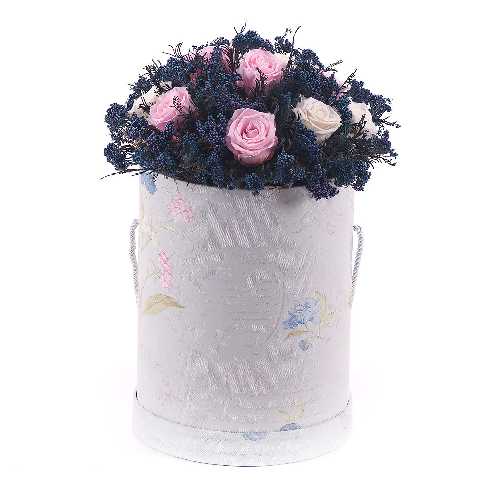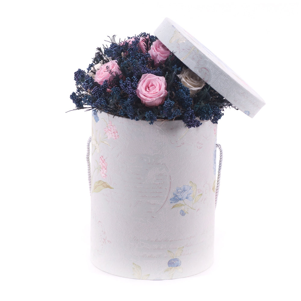 Potešte tých na ktorých Vám záleží a darujte im jedinečný flower box v kombinácii ružových a bielych In Eterno ruží s modrou gypsomilou v štýle Vintage.