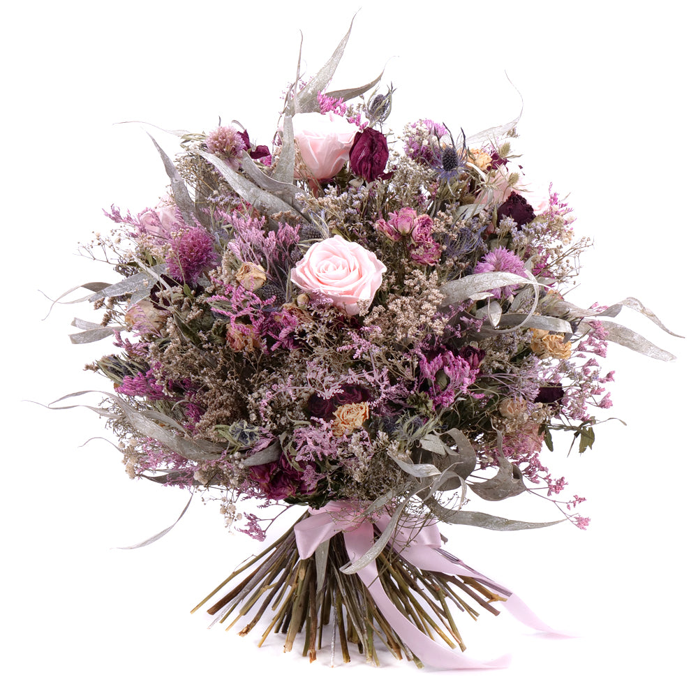Irigo sušená kytica bordové trsové ruže a preparované ružové ruže