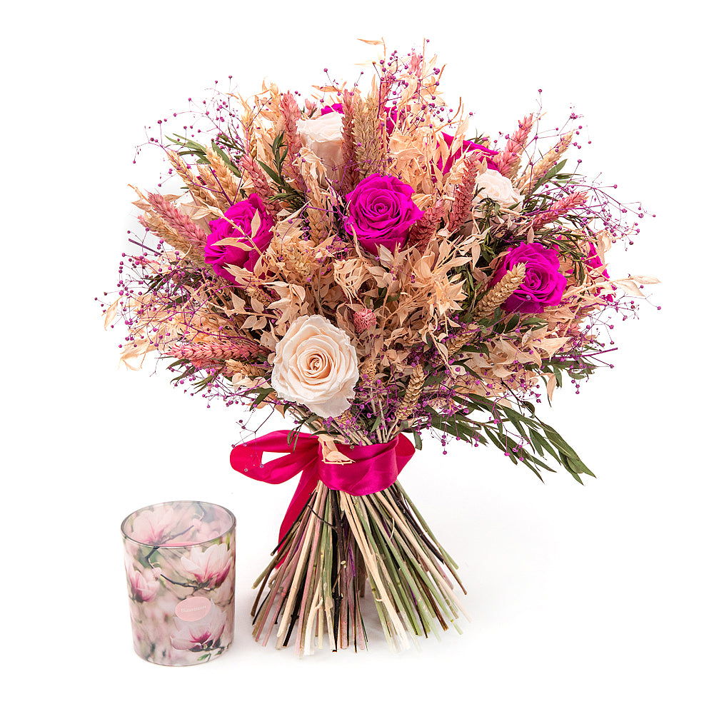 Irigo sušená kytica preparované ružové a cyklámenové ruže sviečka