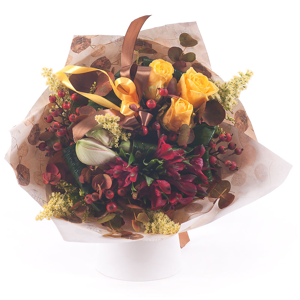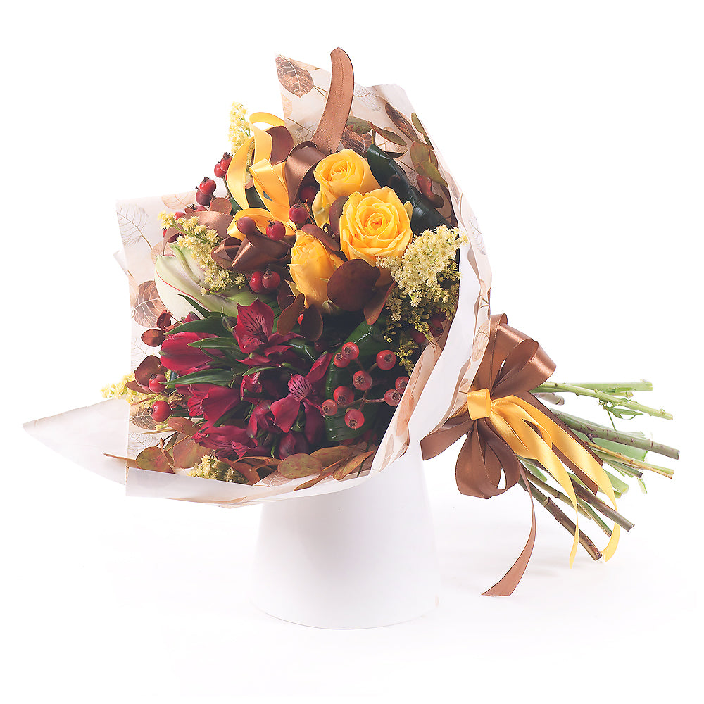 Jesenná kytica zo žltých ruží a červených alstromérií v jesennom papieri s elegantnou žlto-hnedou stuhou.SloženíAmarylis mix rez - 1 ks Čítať viac