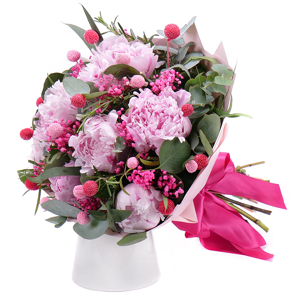 Letná, svieža kytica z pivónií, dekoračnej zelene a prírodných doplnkov s dekoračným papierom so saténovou stuhou.