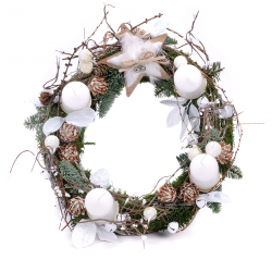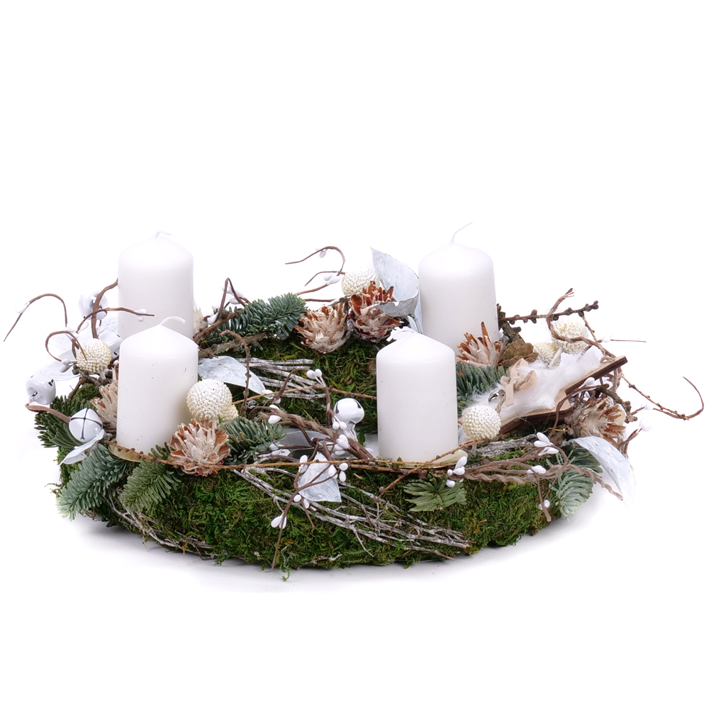 Adventný svietnik s bielymi sviečkami, prírodnými doplnkami a drevenými vianočnými dekoráciami. Podklad aranžmánu tvorí machový veniec. Sviečky - 4 ks sú súčasťou venca.