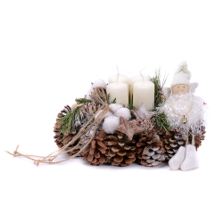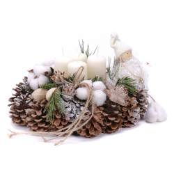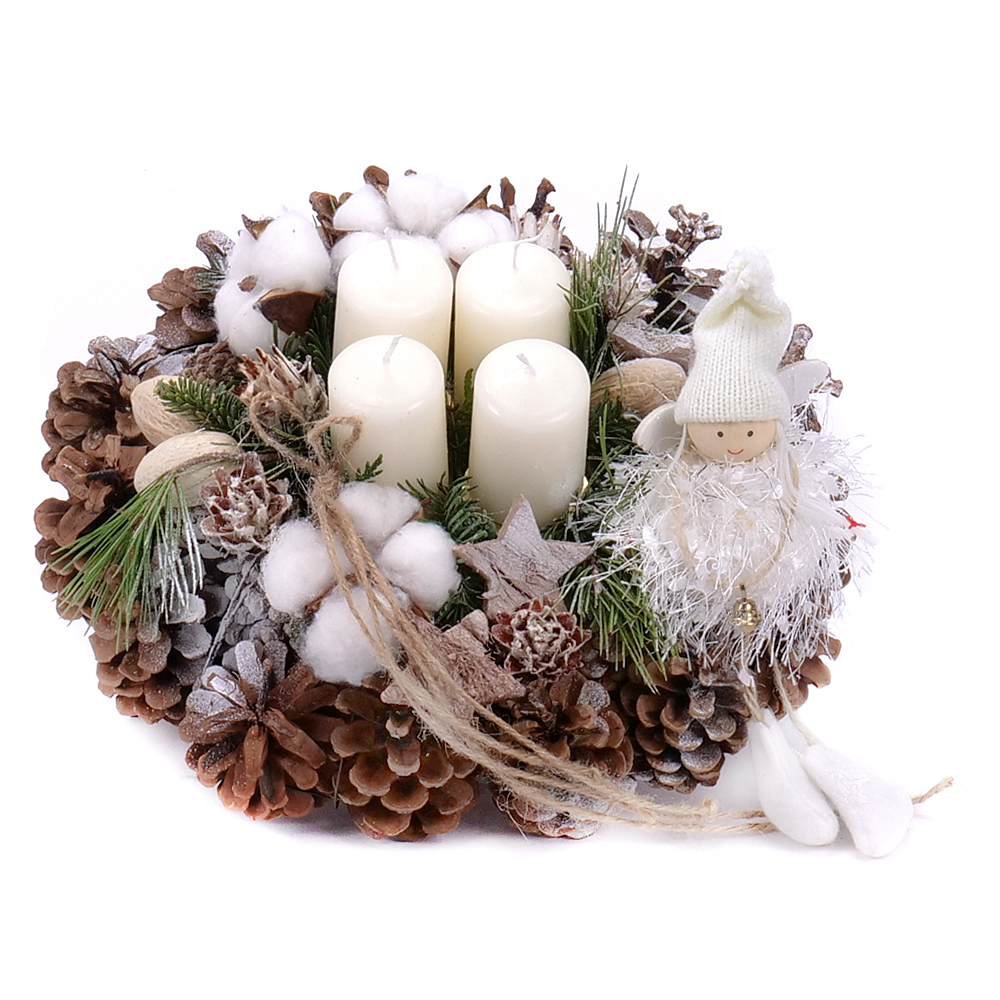 Adventný veniec z prírodných materiálov v podobe šišiek, drevených dekorácií, bavlny, živej čačiny a mini látkového bieleho anjela. Súčasťou sú sviečky - 4 ks.