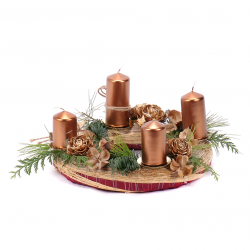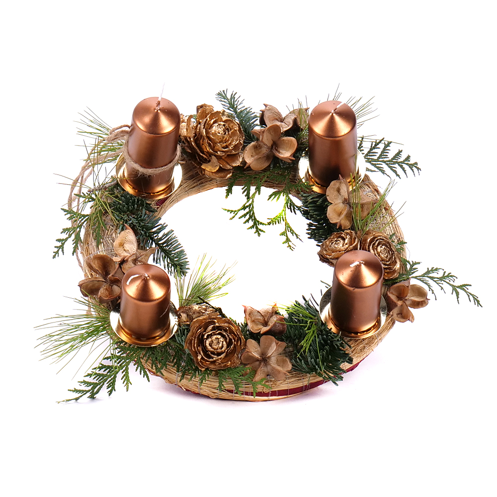 Adventný slamený veniec obtiahnutý dekoračnou látkou so štyrmi medenými sviečkami, živou čačinou a zlatými a prírodnými doplnkami.