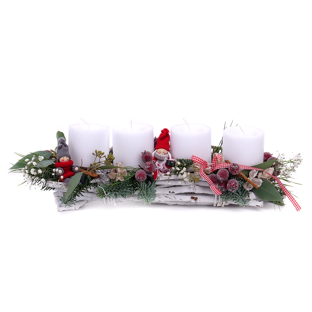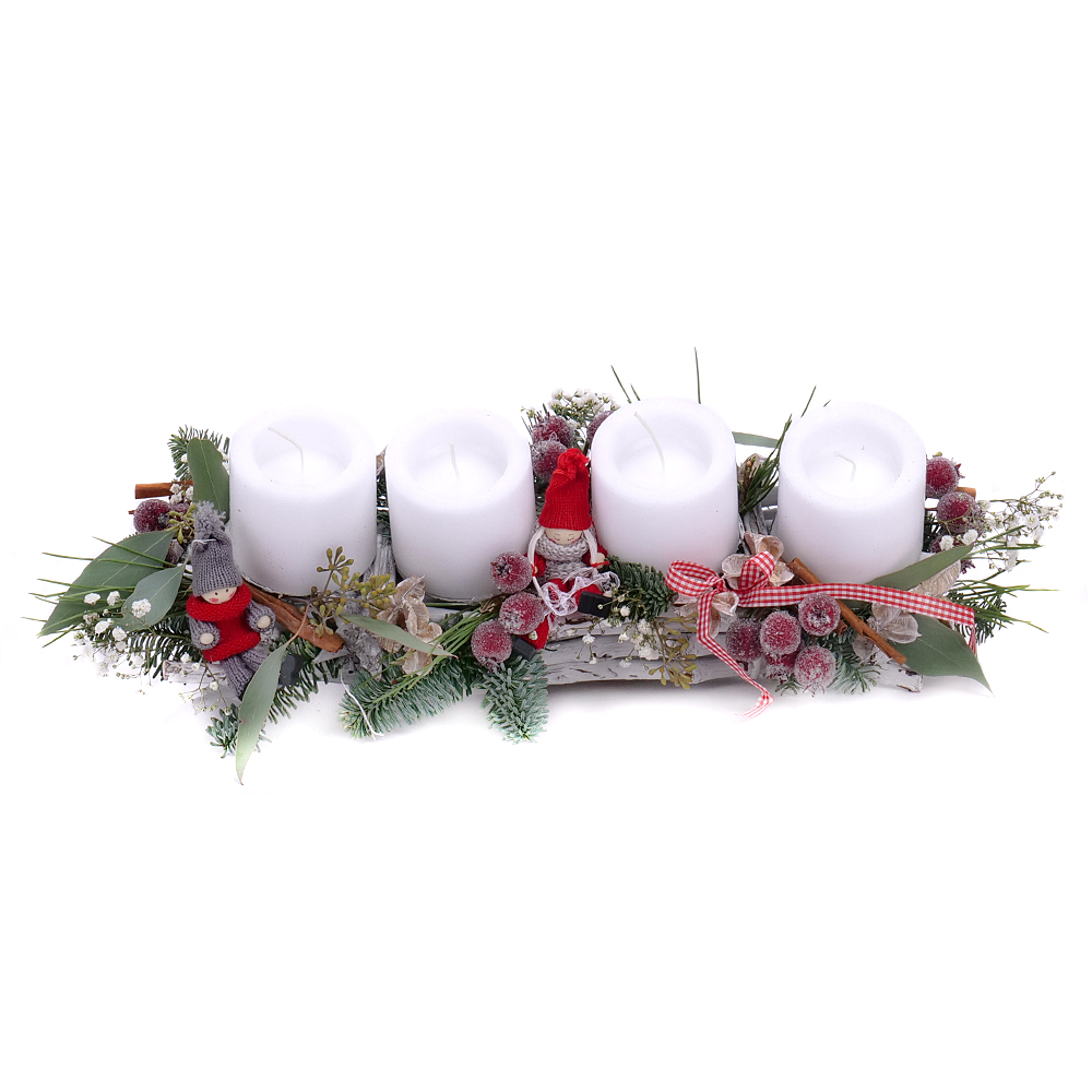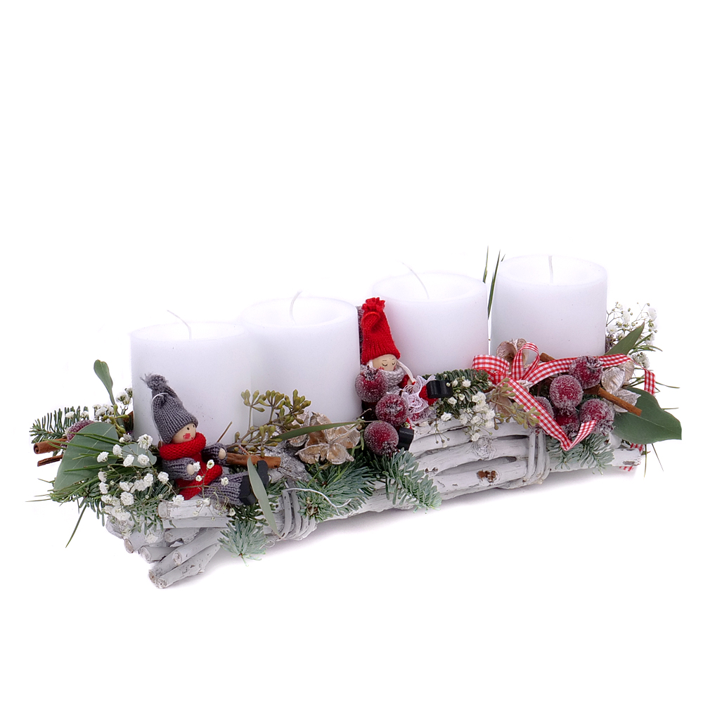 Adventný svietnik na drevenom podklade so sviečkami bielej farby (4ks). V aranžmáne je použitá živá neopadavá čačina, prírodné a umelé doplnky. Aranžmán dopĺňajú mini postavičky v zimnom oblečení.