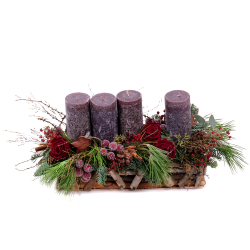 Adventný svietnik na drevenom podklade s In eterno preparovanými červenými ružami, prírodnými doplnkami, živou čačinou a umelými dekoráciami. Súčasťou sú sviečky 4 ks v rustikálnej farbe.