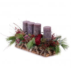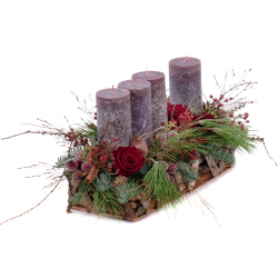Adventný svietnik na drevenom podnose s In eterno červenými ružami