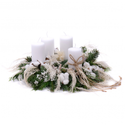 Adventný veniec zo živej čačiny biele sviečky biele doplnky