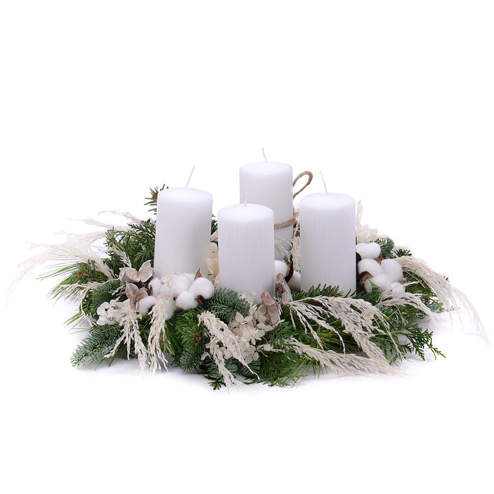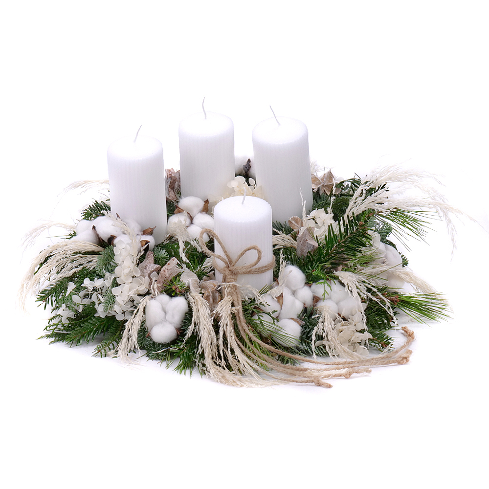 Adventný veniec zo živej čačiny s doplnkami bavlny, prírodných tráv a sušených doplnkov. Súčasťou sú 4 ks bielych sviečok.