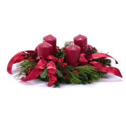 Adventný veniec zo živej čačiny dozdobený ilexom a dekoračnou zeleňou s vianočnou stuhou. Súčasťou sú sviečky červenej farby 4 ks.