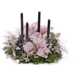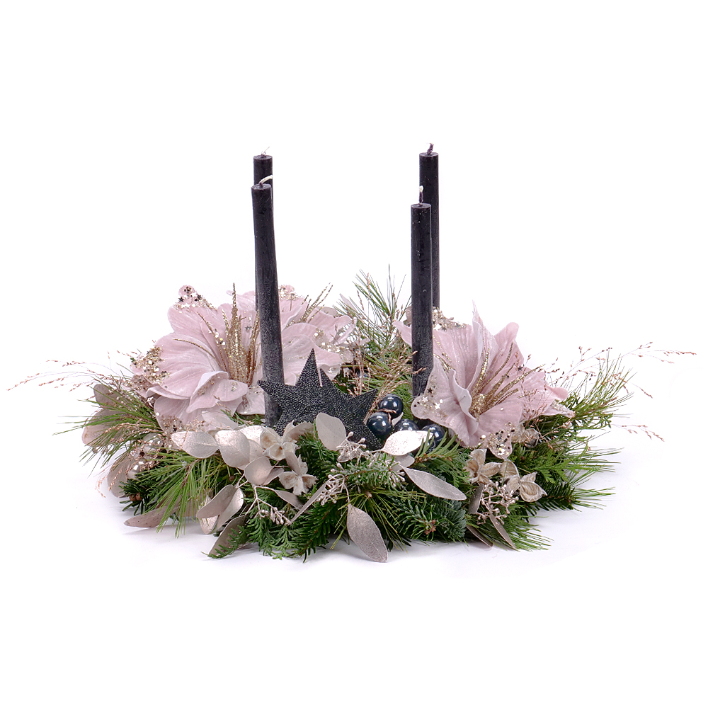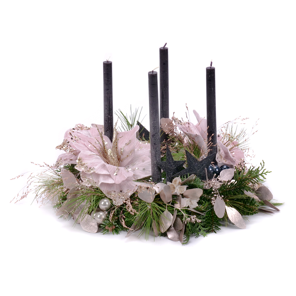 Adventný veniec zo živej čačiny v jemnej staroružovej farbe s vysokými kónickými sviečkami čiernej farby. Veniec je doplnený o vianočné dekorácia a prírodné doplnky v pastelových odtieňoch ružovej.