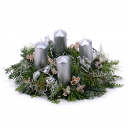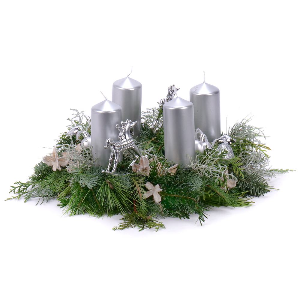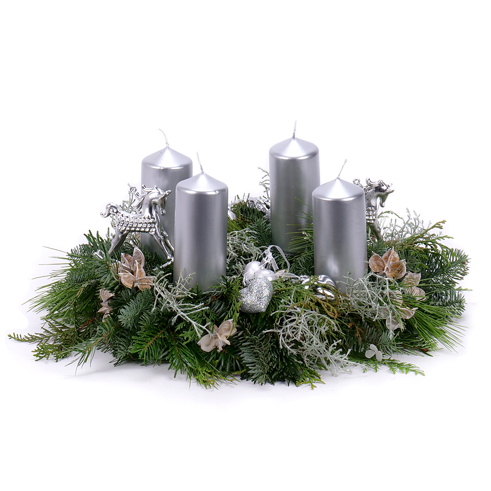 Adventný veniec zo živej čačiny so striebornými doplnkami a striebornými sviečkami - 4 ks, ktoré sú súčasťou venca.