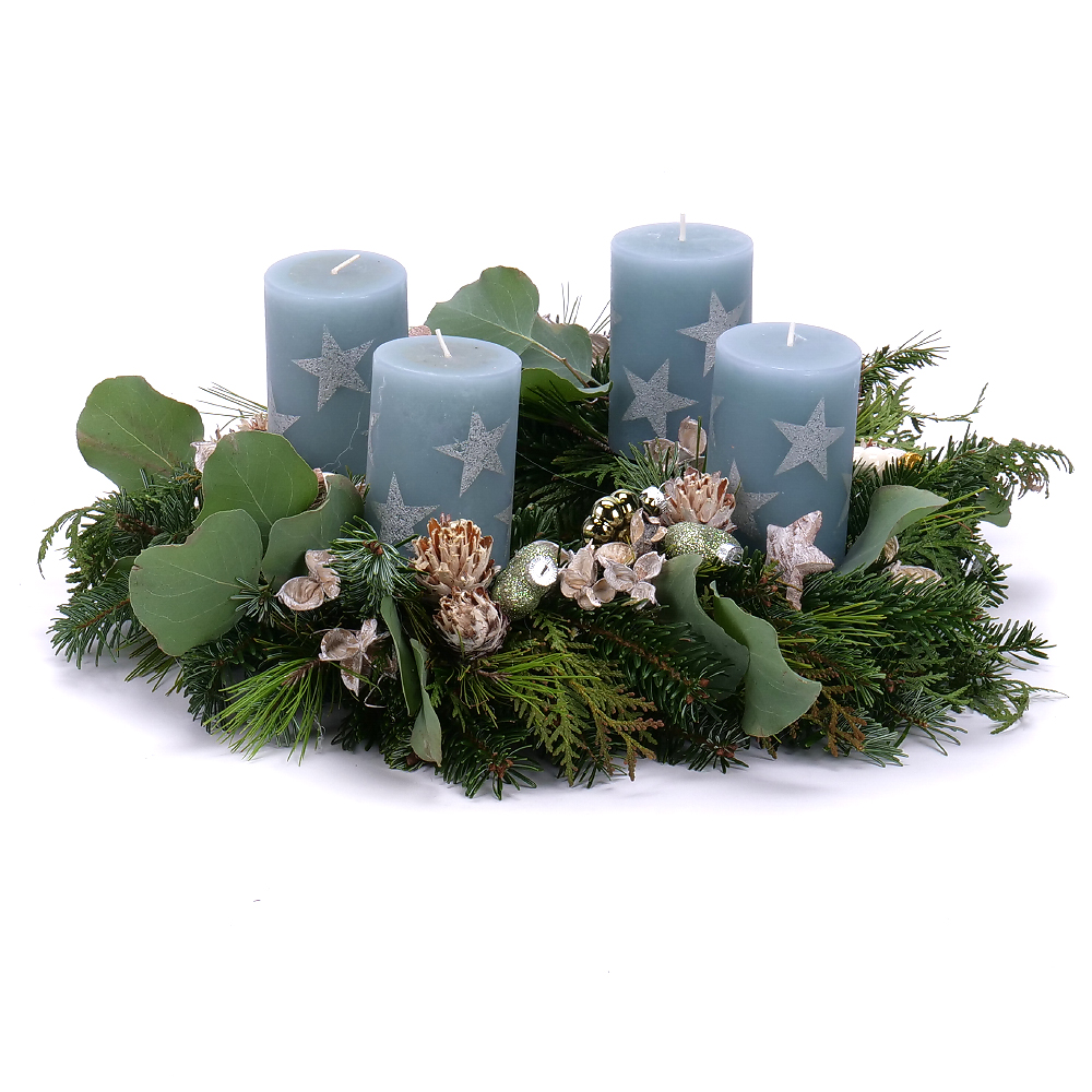 Adventný veniec zo živej čačiny doplnený eukalyptom, prírodnými materiálmi a vianočnými ozdobami. Súčasťou sú 4 ks sviečok. ... Viac