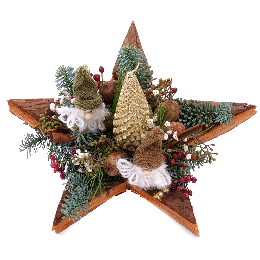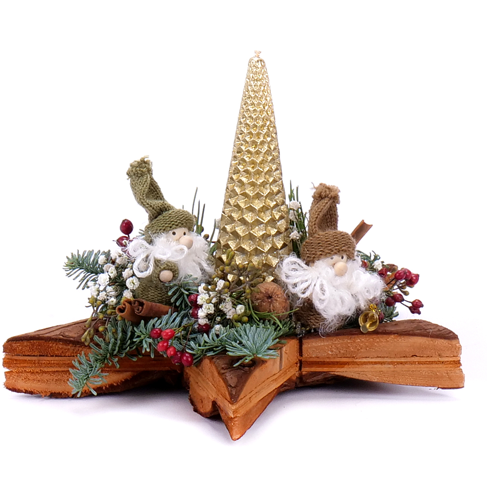 Prírodný aranžmán na drevenom podklade v tvare hviezdy so živou čačinou, prírodnými doplnkami a mini postavičkami Mikuláša. Súčasťou je sviečka v zlatej farbe.