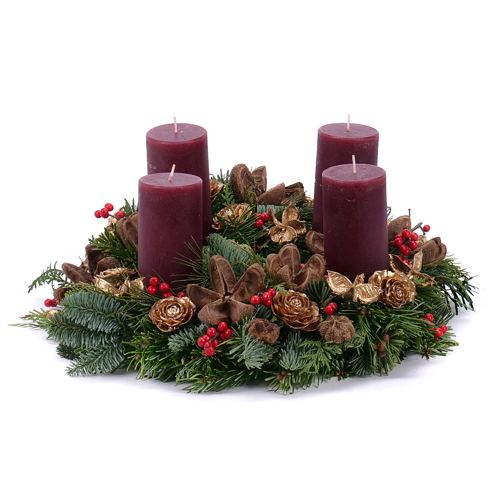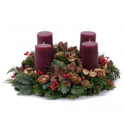 Veniec zo živej čačiny s prírodnými doplnkami a zlatými farbenými materiálmi. Súčasťou sú sviečky 4 ks. Vkusne skrášli Váš domov a pripomenie Vám príchod Vianoc v čase adventného obdobia.