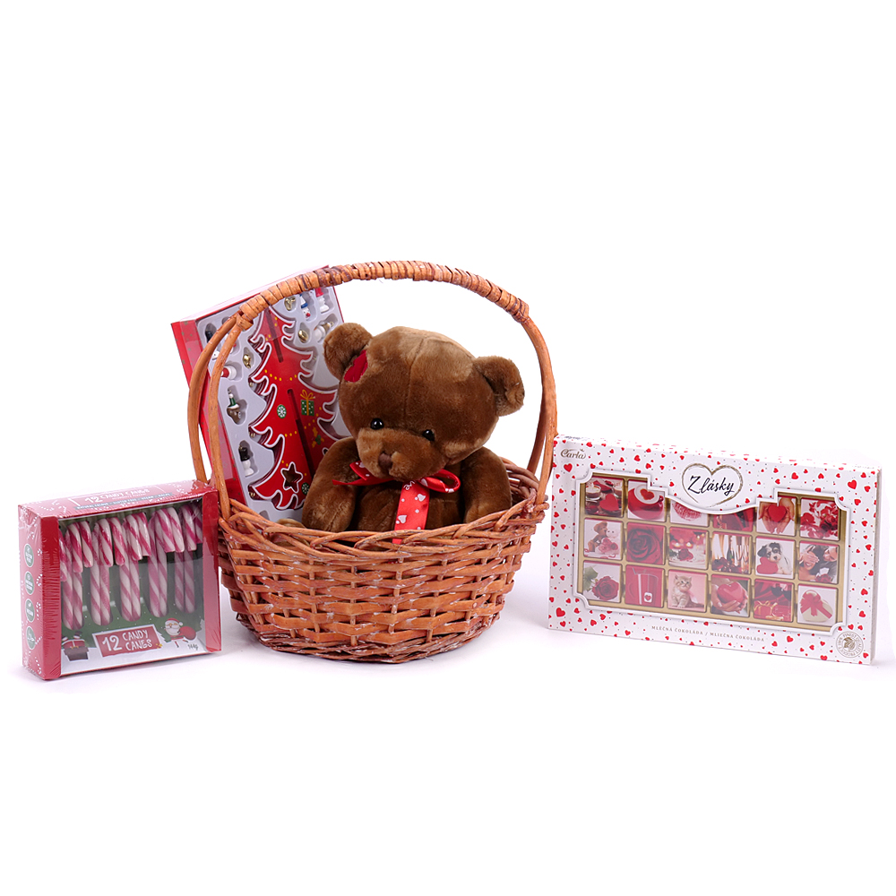 Veselý dárek v červeném proutěném košíku s cukrovinkami a chutným proseccem Reya. Součástí košíku je také látková panenka v červenobílém oblečení. ... Více
