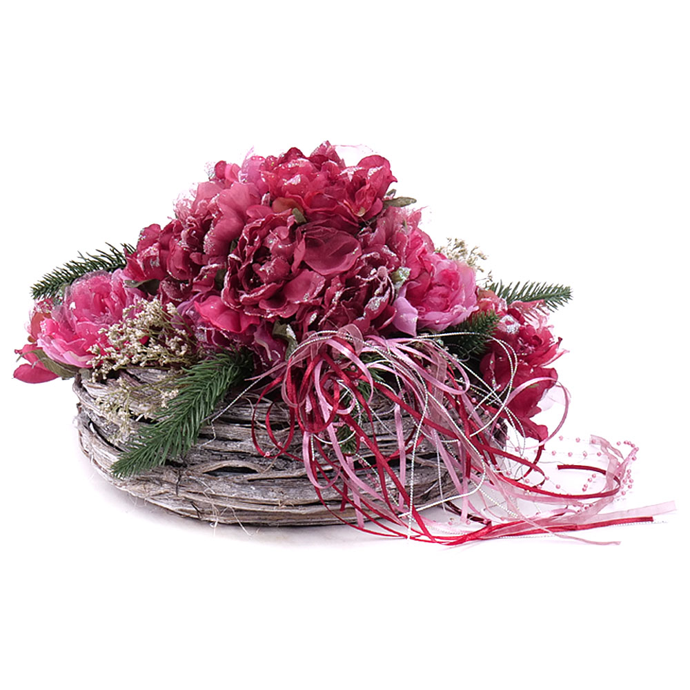 Smútočný aranžmán na prútenom podklade s umelými bordovými kvetmi.