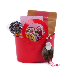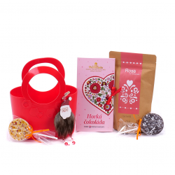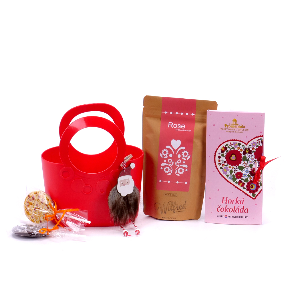 Veselý darček k sviatku sv. Mikuláša - darčeková plastová taška - 1 ks, čokoládové lízatká - 2 ks, horká ručne robená čokoláda - 1 ks a bylinkový čaj - 1 ks. Súčasťou je malá závesná dekorácia.