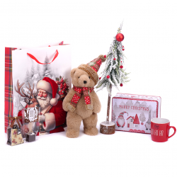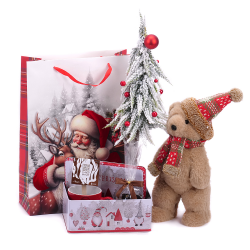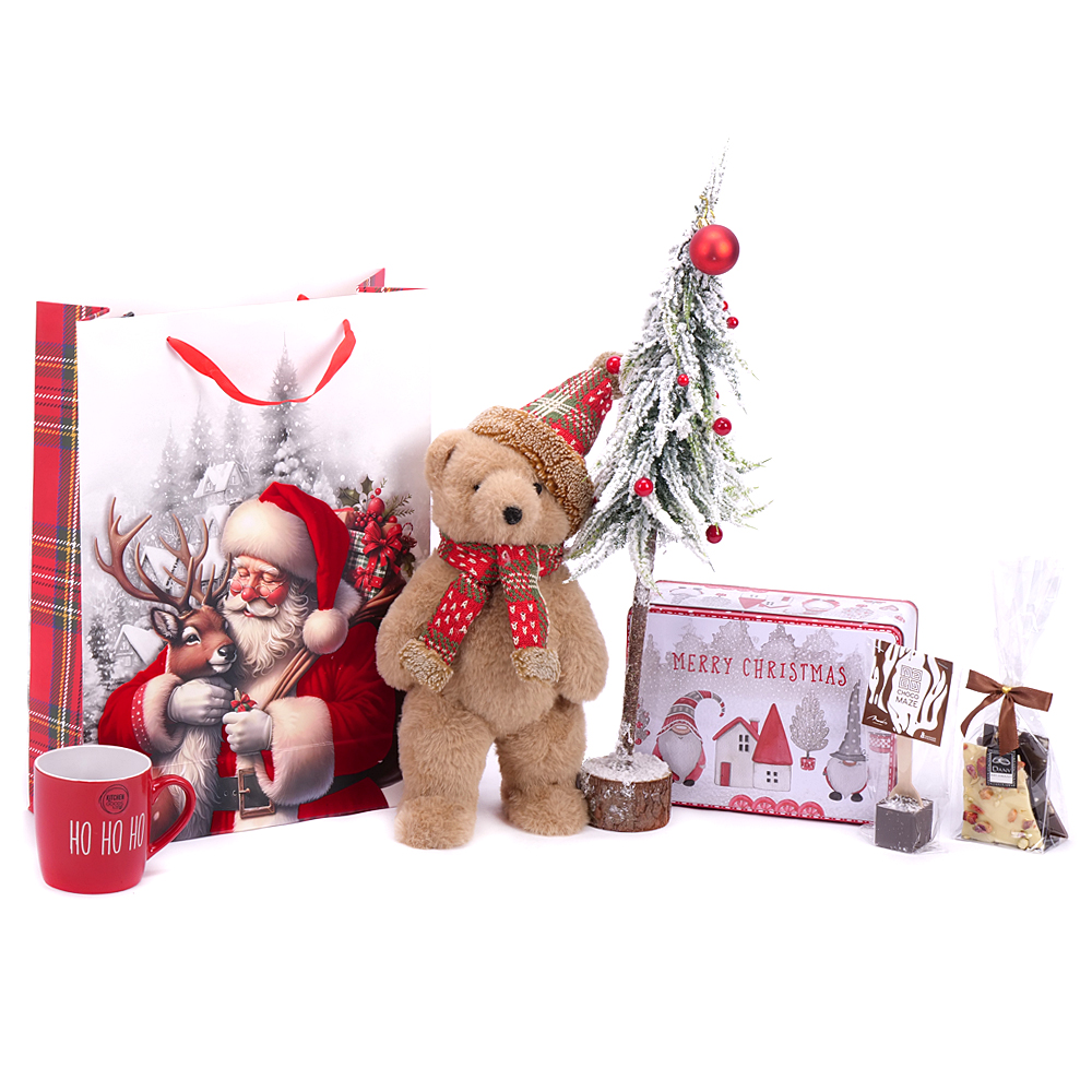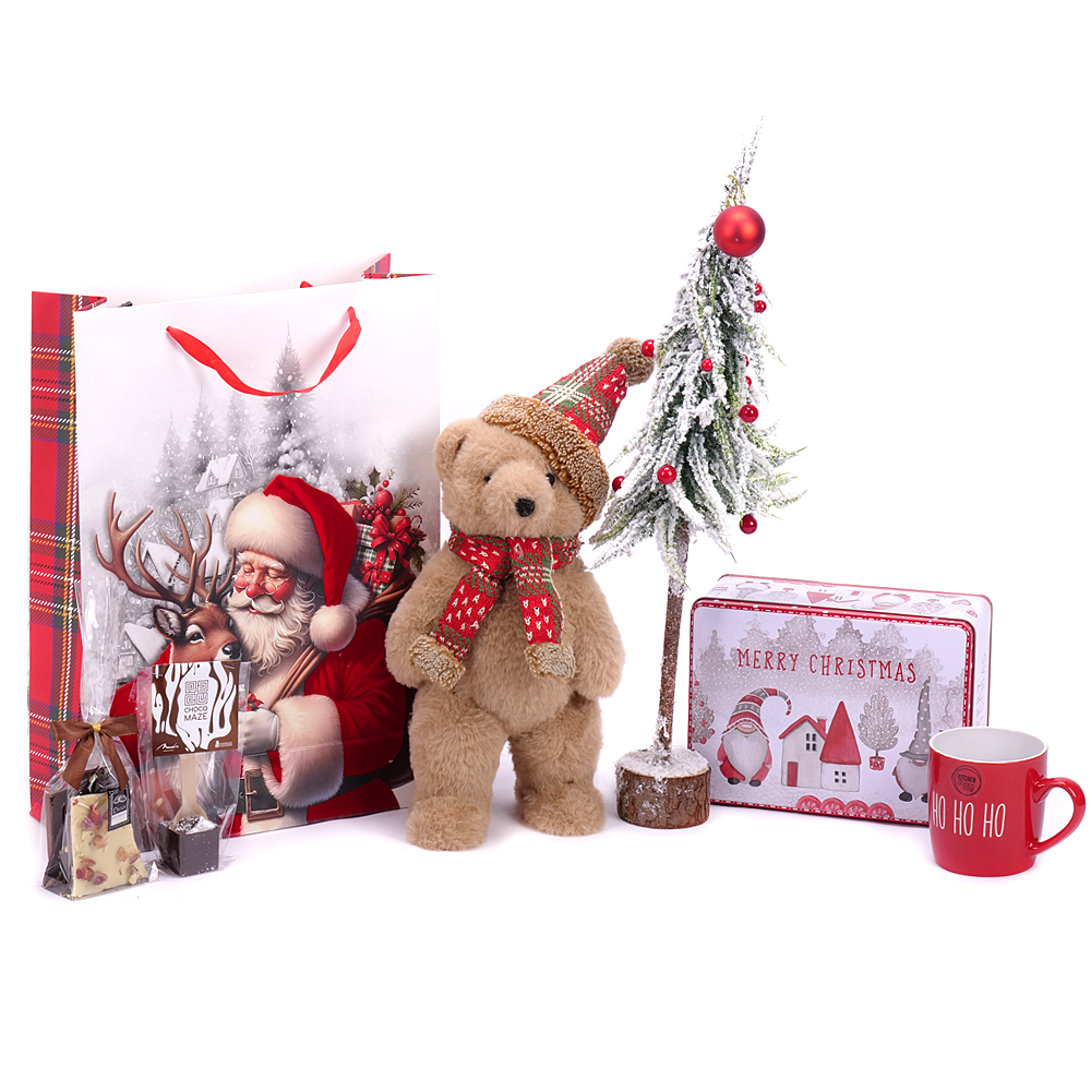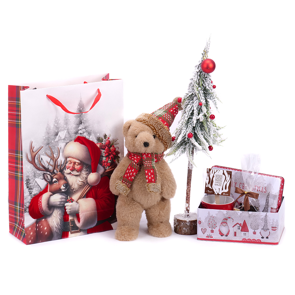Darčeková papierová taška s plyšovým mackom - 1 ks, vianočným umelým stromčekom - 1 ks, plechovou dózou - 1 ks, keramickým hrnčekom, lámanou čokoládou so sušeným ovocím a horúcou čokoládou na paličke.