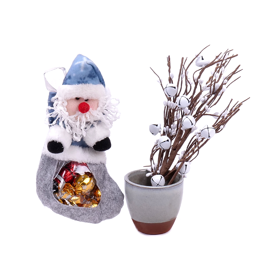 Darčekový set s Mikulášom, cukrovinkami, dekoračnou vianočnou vetvičkou s rolničkami a keramickým obalom.