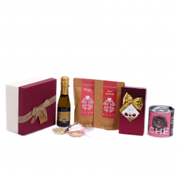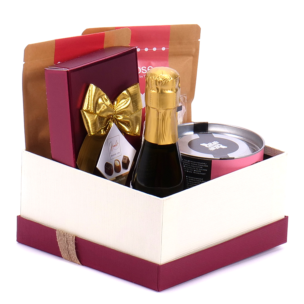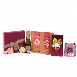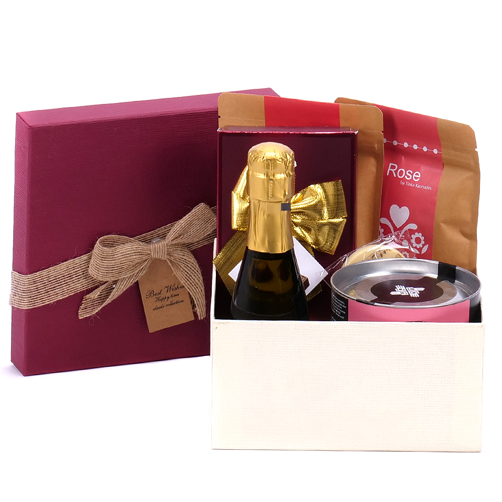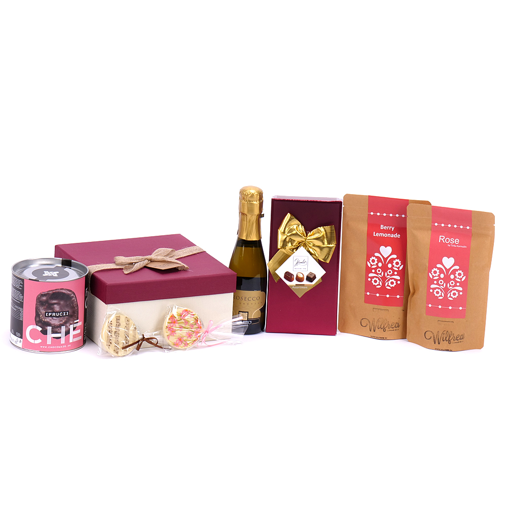 Darčekový box vhodný na gratuláciu k sviatku menín, narodením alebo výročia. Set obsahuje: ovocný čaj - 1 ks, bylinkový čaj - 1 ks, dezert Hamlet - 1 ks, prosecco Moletto - 1 ks a ručne robený dezert - jahody v čokoláde - 1 ks.