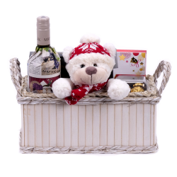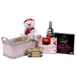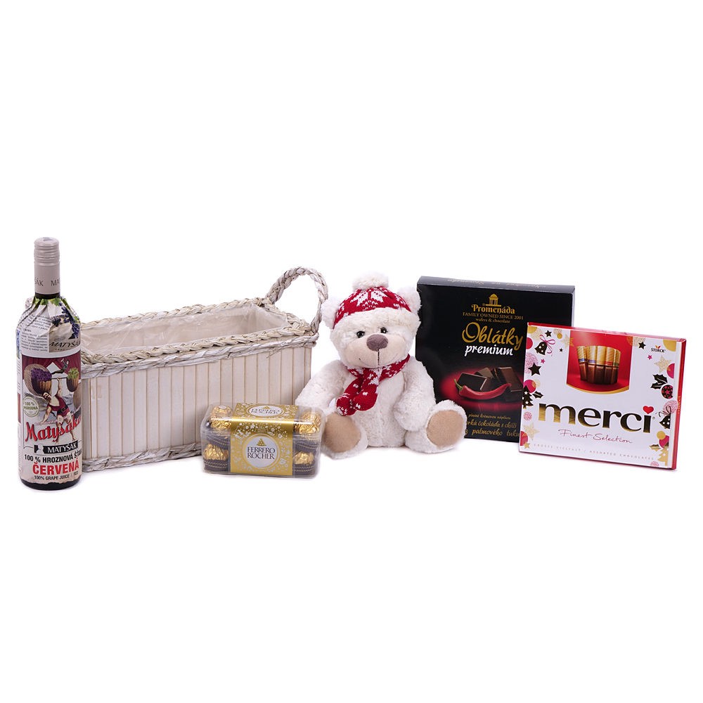 Darčekový set s plyšovým mackom, dezertom Merci, hroznovou šťavou Matyšák, oblátkami s horkou čokoládou a chilli a dezertom Ferrero Rocher. Súčasťou setu je drevený krémový box.