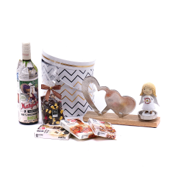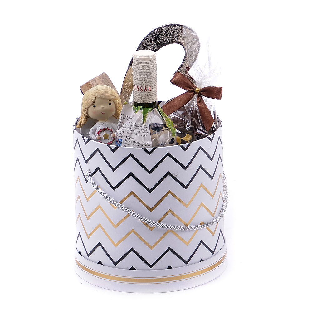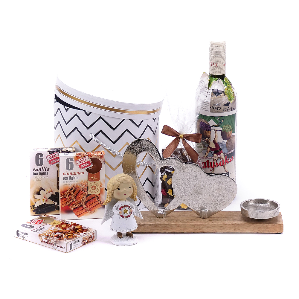 Okrúhly dekoračný box s dreveným svietnikom v tvare srdca, ozdobným keramickým anjelom, ručne robenou lámanou čokoládou Dany, bielou hroznovou šťavou Matyšák a čajovými sviečkami rôznych vôní - 3 balenia. ... Viac