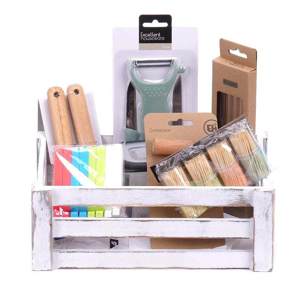 Praktický darček pre všetky gazdinky. Set obsahuje: otvárač na konzervy - 1 ks, otvárač na fľaše - 1ks, sadu slamiek s kefkou na čistenie - 1 ks, sadu špáradiel - 1 ks, plastovú dózu - 1 ks, škrabku a sadu 2 ks nožov, sadu -uzatvárateľné klipsy na potraviny - 1 ks. Súčasťou setu je drevený box.