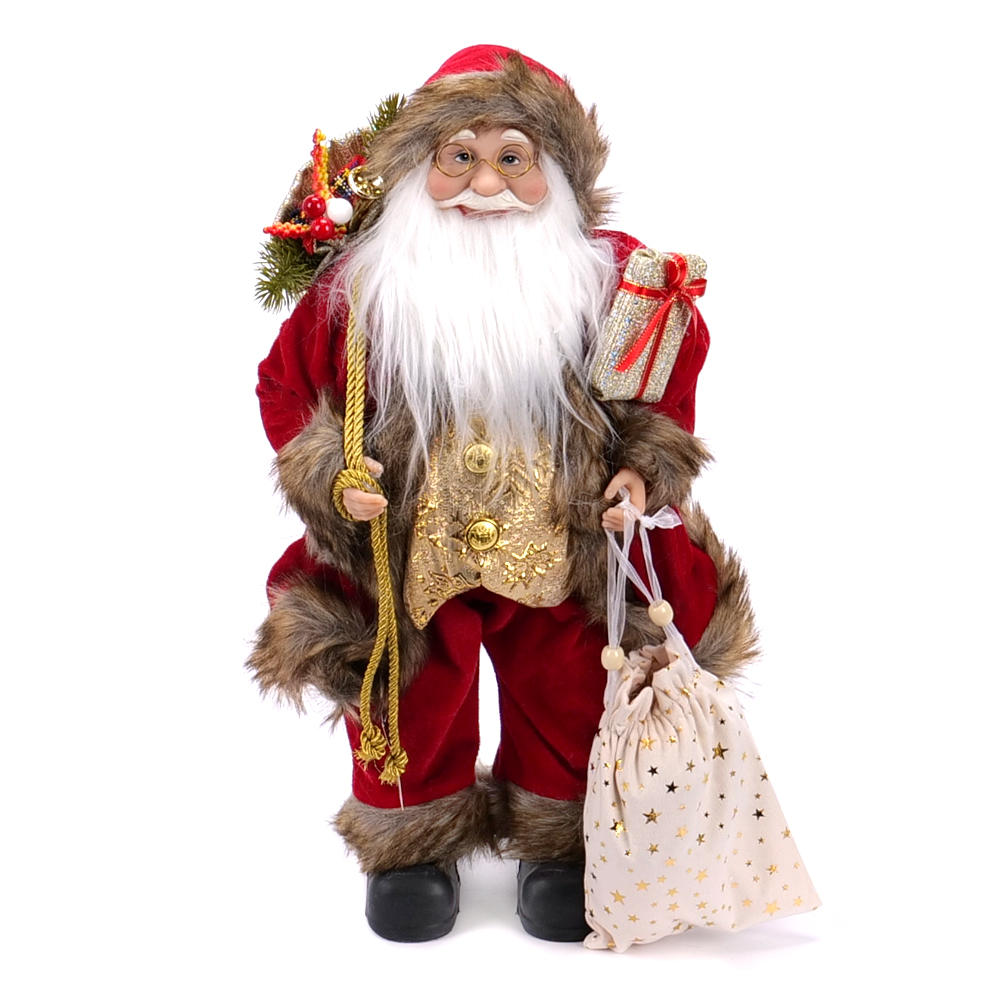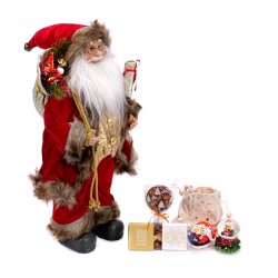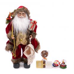 Darčekový set - postava Mikuláša s vrecúškom plným prekvapení - vajíčko kinder joy - 1 ks, čokoládové lízatko - 1 ks, mini čokoláda - 1 ks a ozdobná dekoračná vianočná guľa.