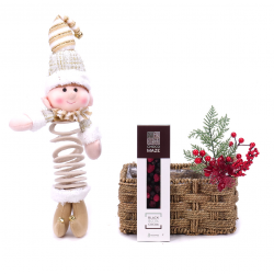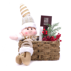 Darček v prútenom obale s postavičkou trpaslíka na strune s vianočnou vetvou a ručne robenou čokoládou so sušeným ovocím. Malý darček pre potešenie Vašich drahých.