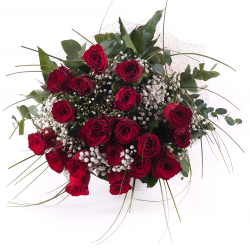 Kytica viazaná z 65 cm vysokých červených ruží doplnená o gypsophilu, krajkovaný obal a elegantne previazaná červenou ozdobnou saténovou stuhou.