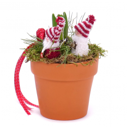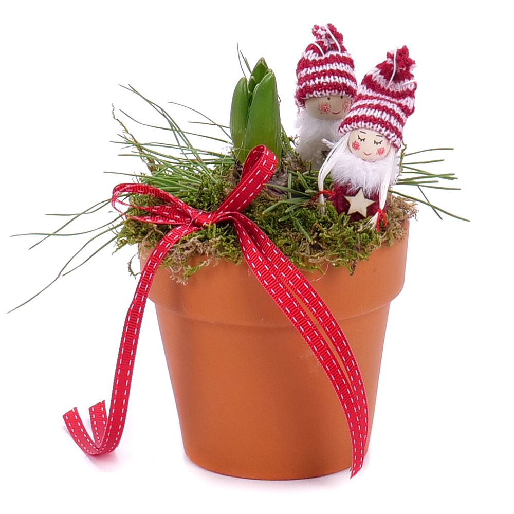 Veselý darček v podobe živého hyacintu v keramickom obale s dekoráciou a stuhou s prírodnými doplnkami.