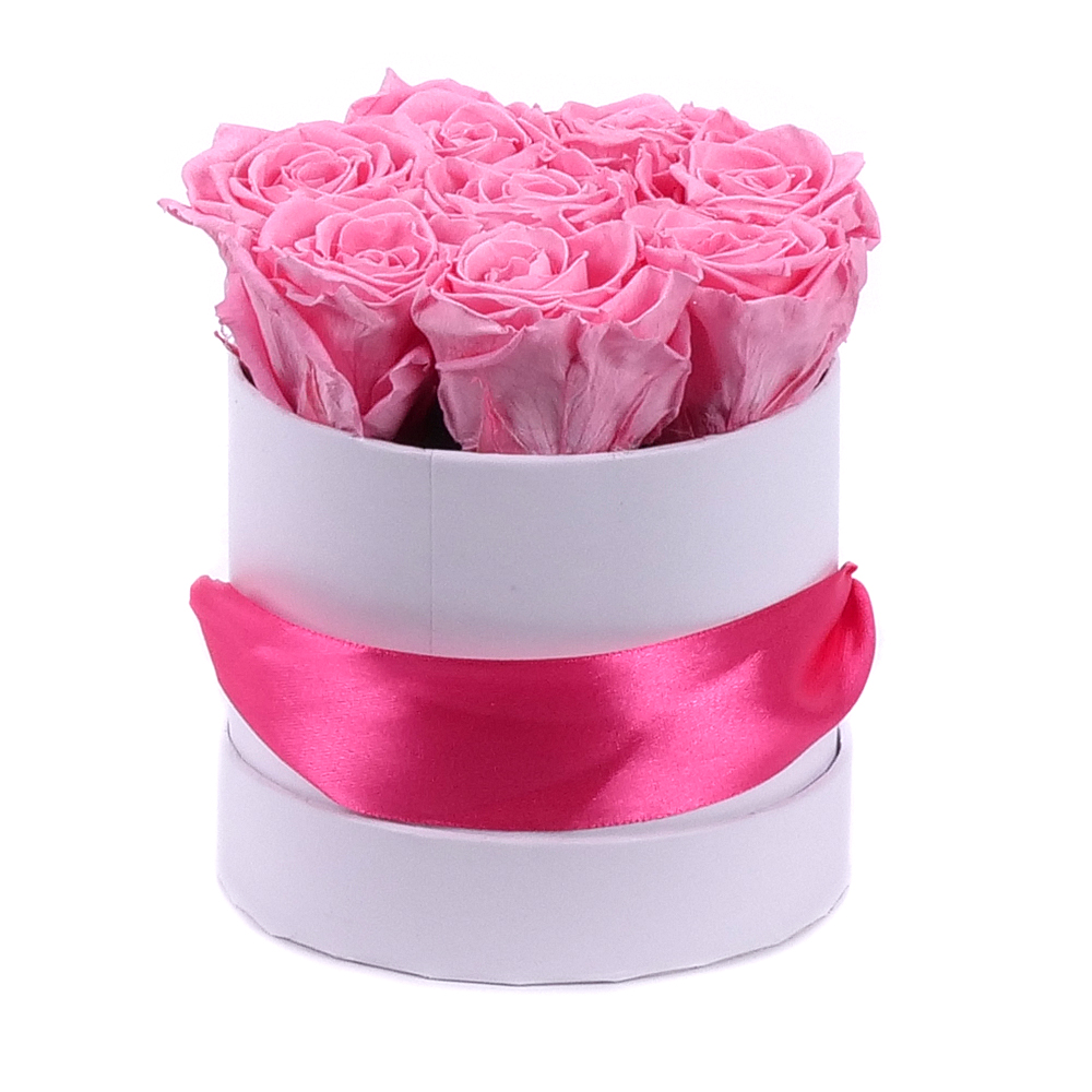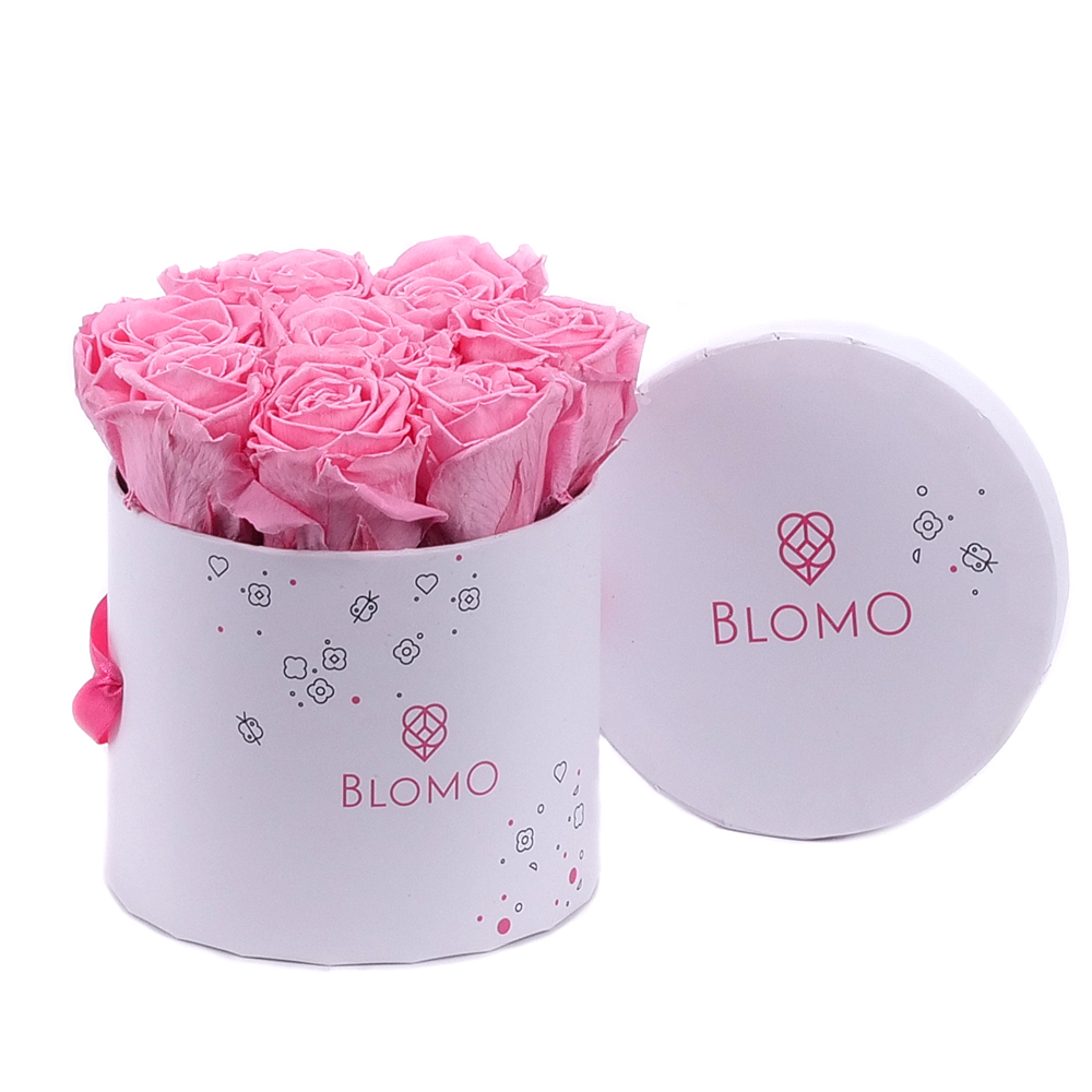 Štýlový flower box s In eterno preparovanými ružami jemnej ružovej farby. Box obsahuje 8 ks večných ruží, ktoré vydržia dlhý čas bez akejkoľvek starostlivosti a potešia na sviatok narodenín či menín.