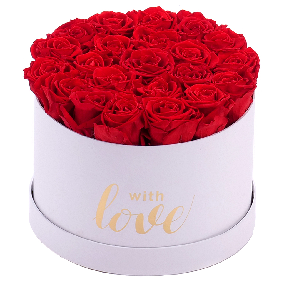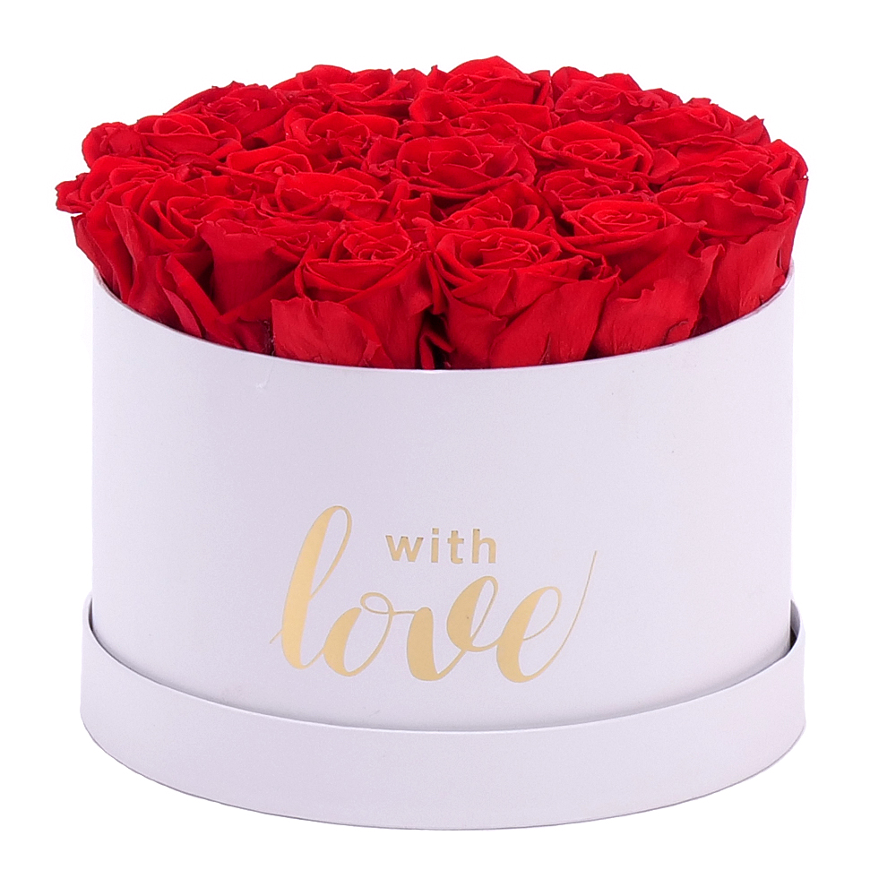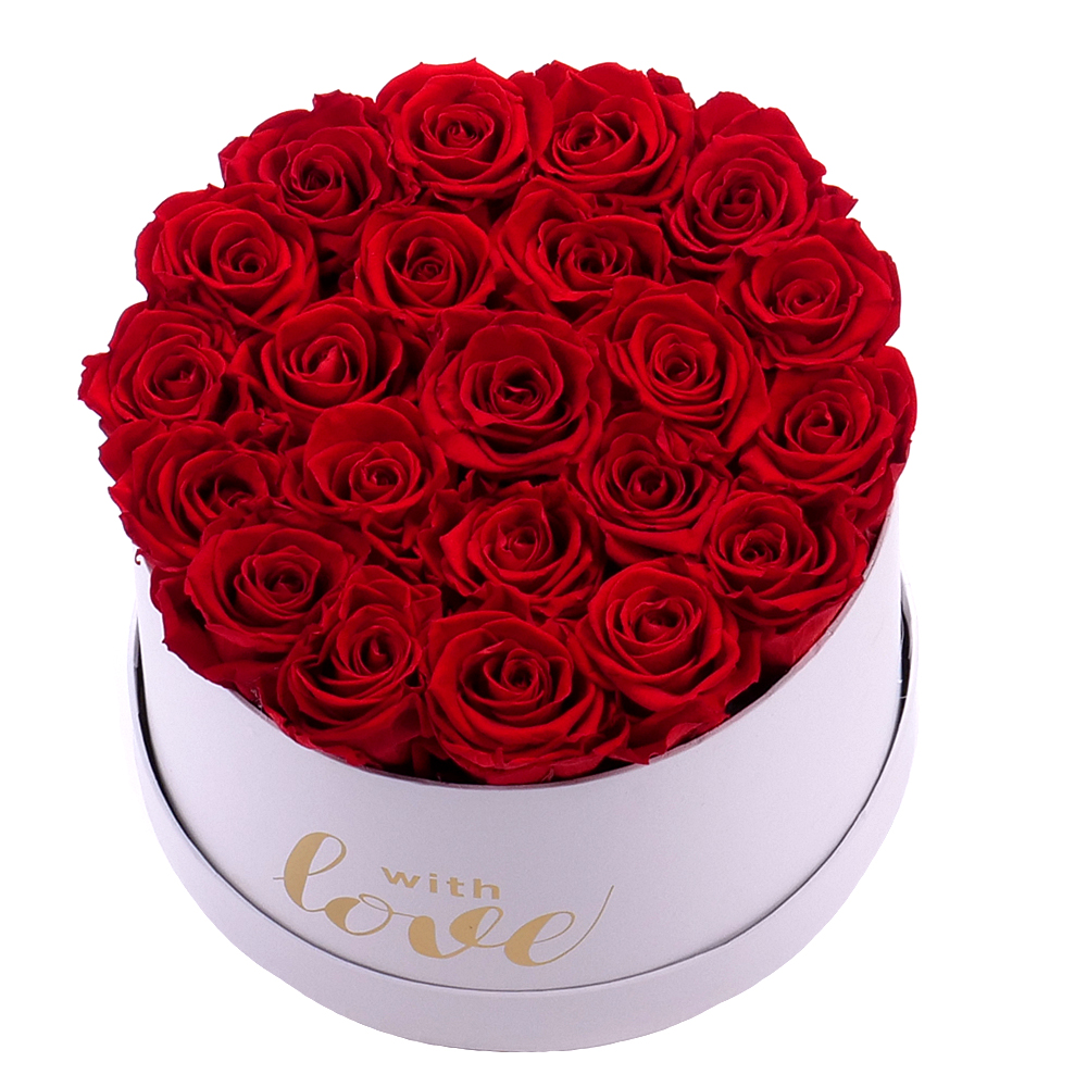 Okrúhly biely box s In eterno červenými preparovanými ružami v počte 22 ks je vhodným darčekom k sviatku pre Vašich drahých.
