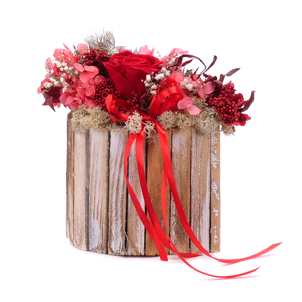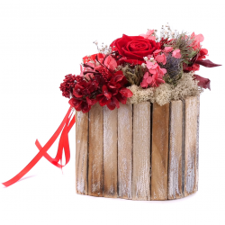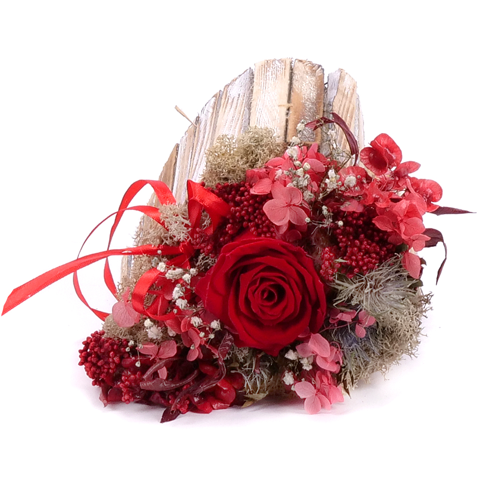 Drevený box v tvare srdca s preparovanou In eterno ružou červenej farby s prírodnými materiálmi, sušenými a preparovanými doplnkami. Darček ktorý obdarovanej osobe vydrží dlhý čas.