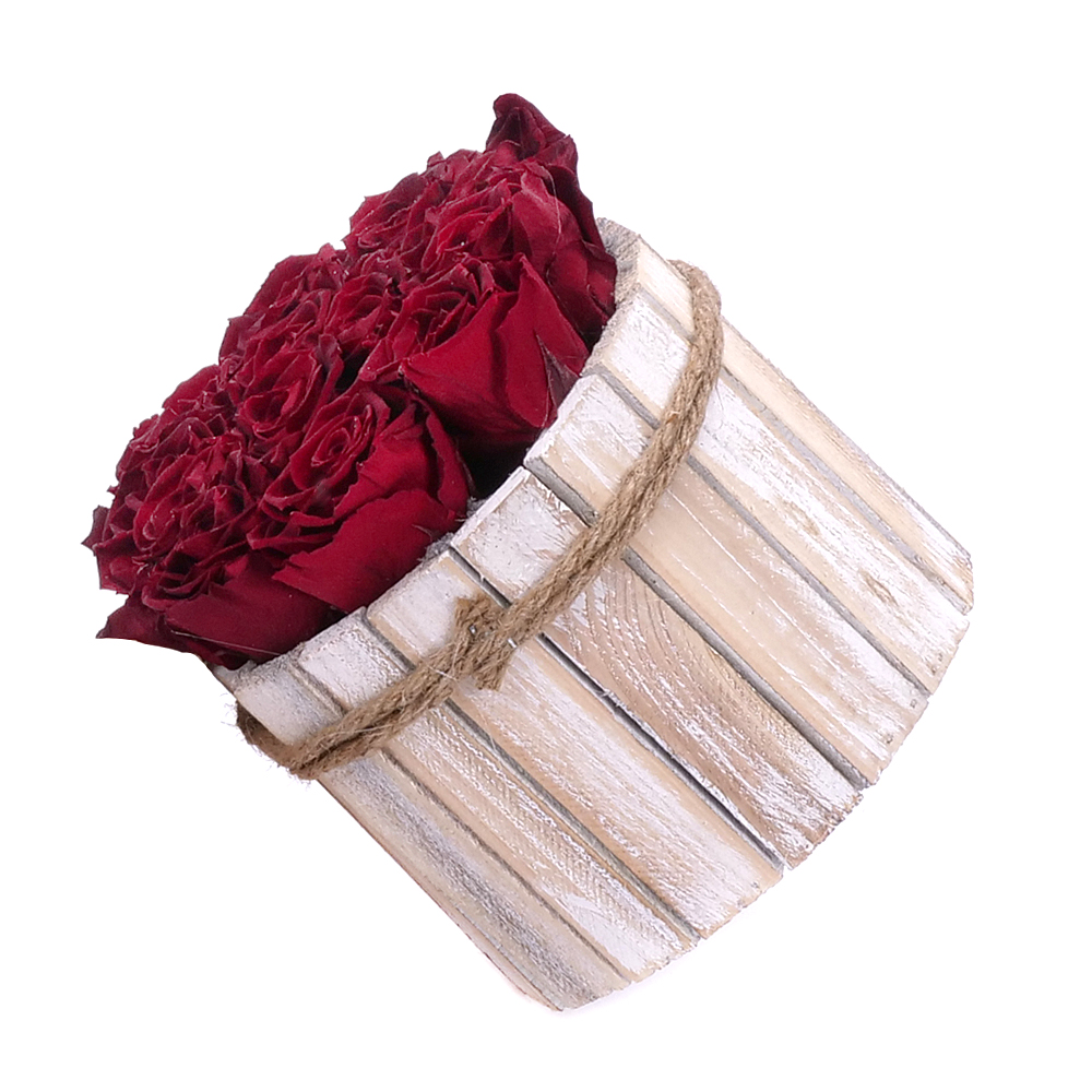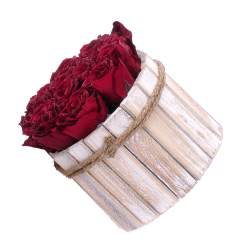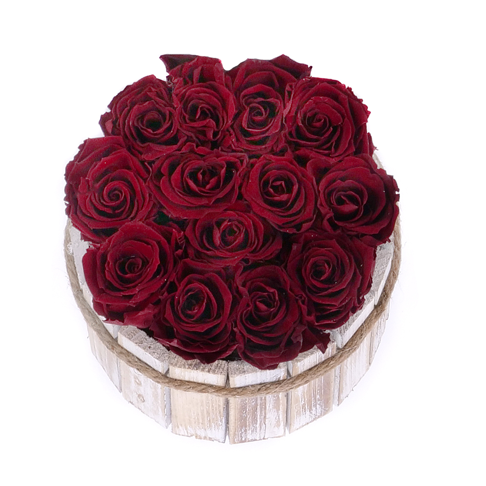 Elegantný drevený box s 13 ks preparovanými večnými ružami vo farbe burgundy. Darček k sviatku alebo len tak pre potešenie.