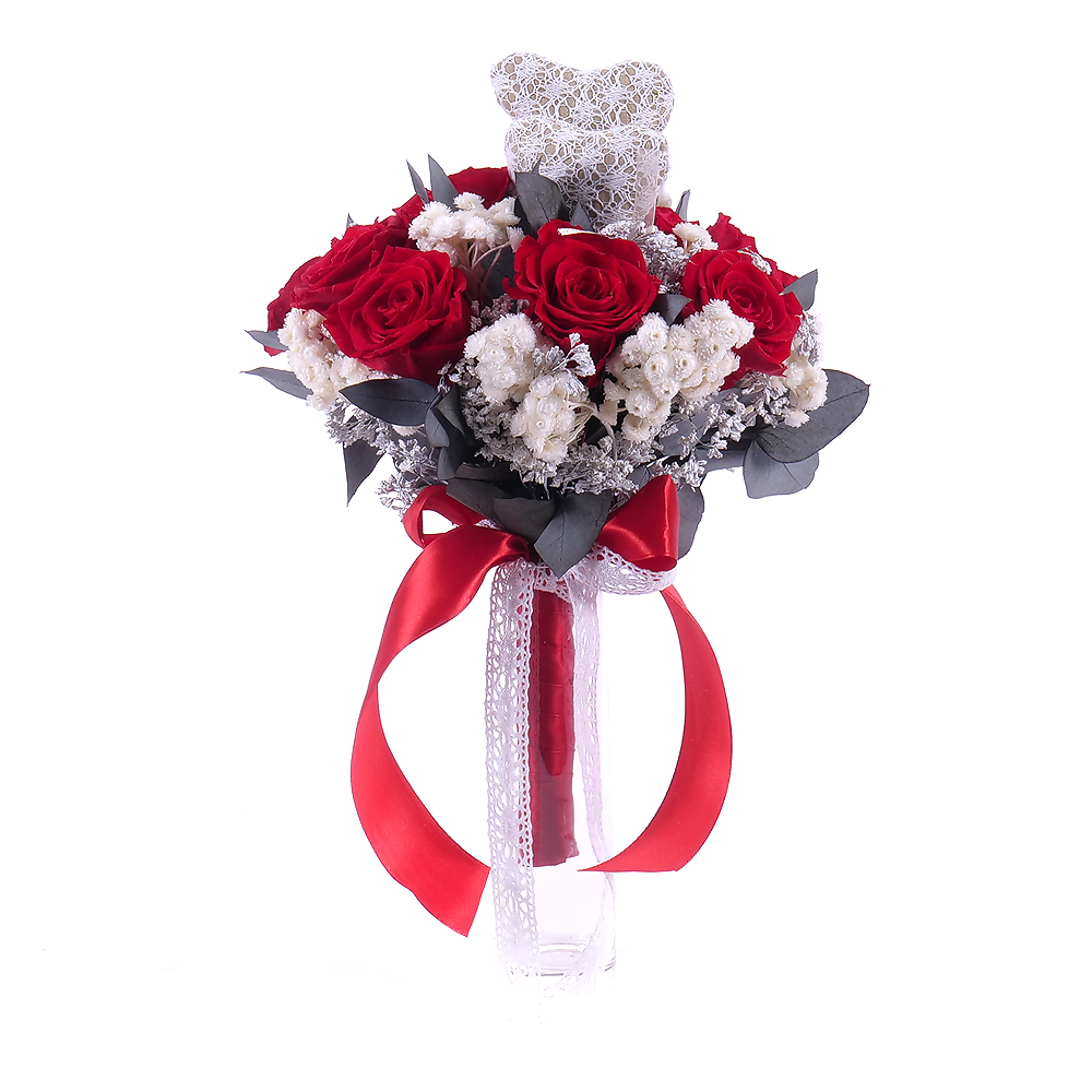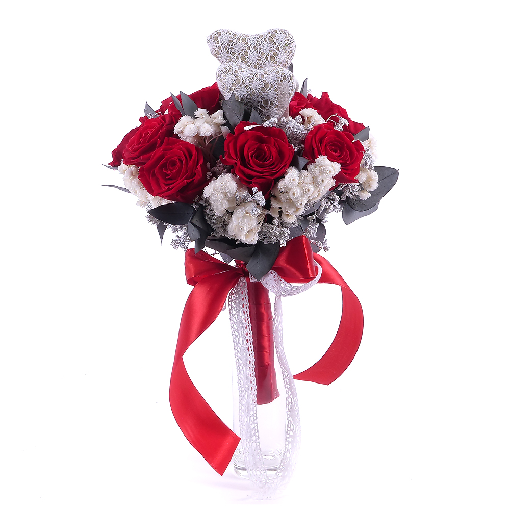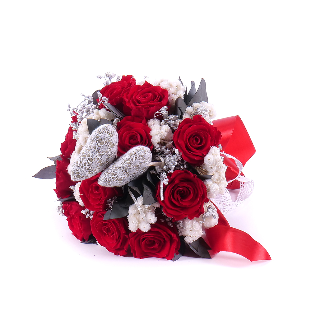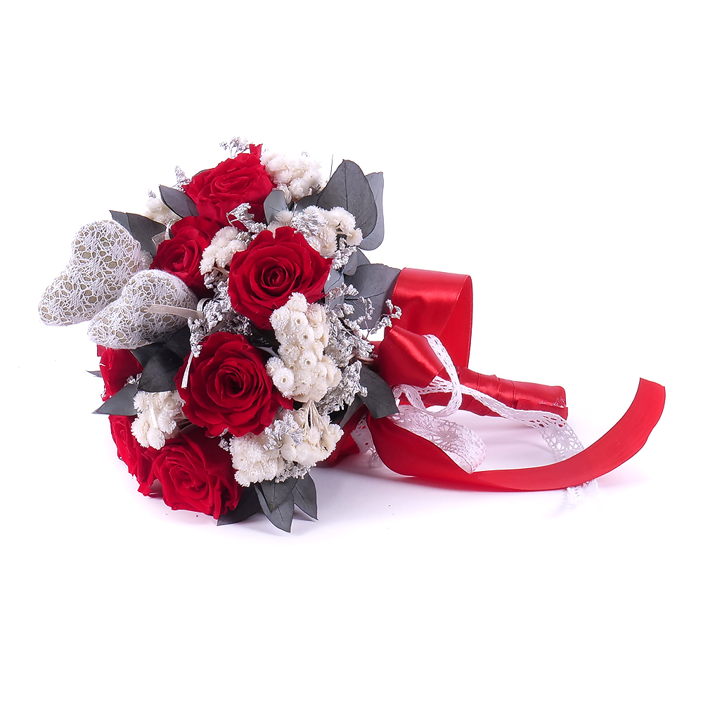 Kytica aranžovaná z In eterno večných červených ruží, doplnená dekoračnými srdiečkami a zeleňou.
