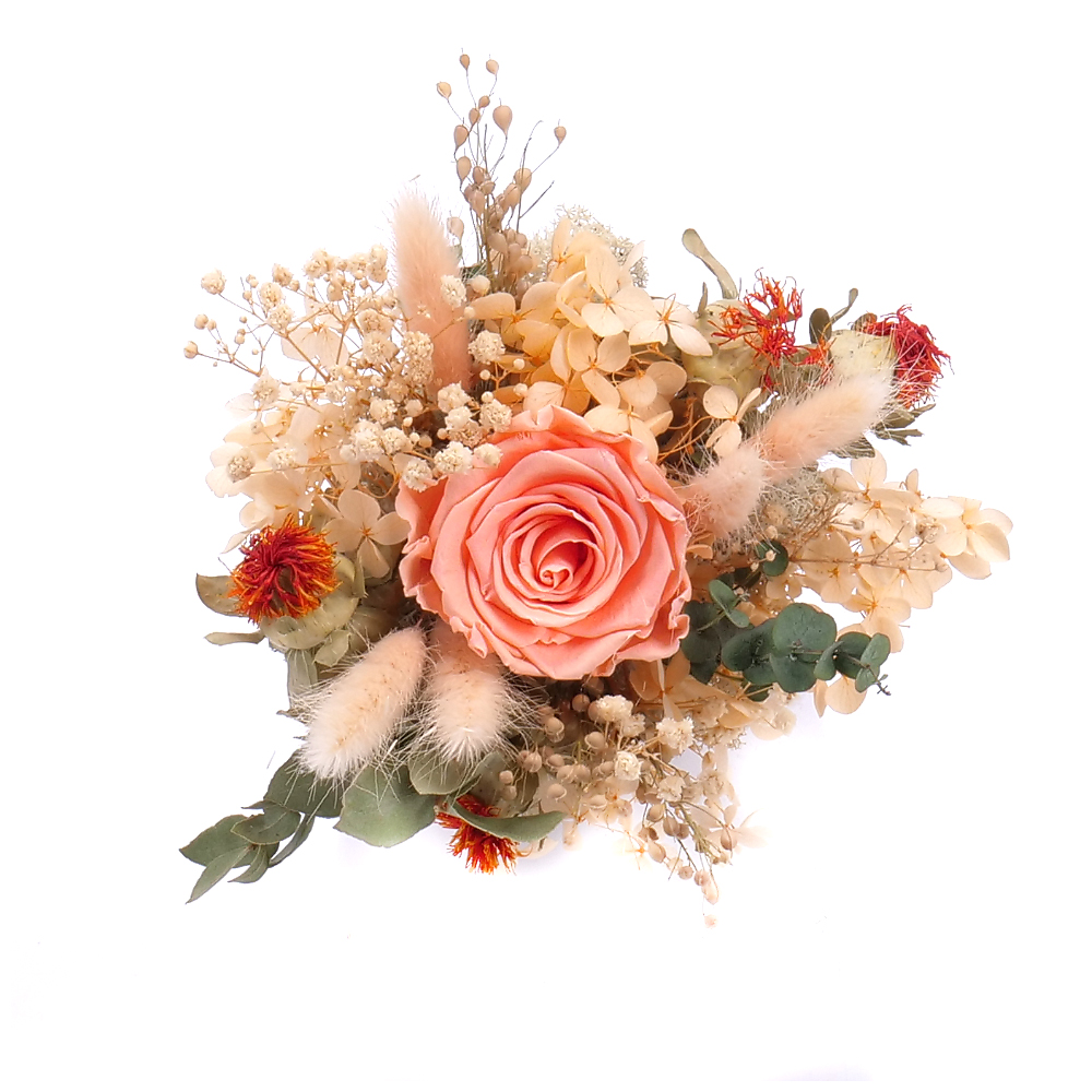 Elegantný aranžmán v plastovom pohári s In eterno večnou oranžovou preparovanou ružou. Aranžmán je doplnený prírodnými a stabilzovanými prírodnými materiálmi. Vhodná dekorácia na stôl na rôzne príležitosti ako aj darček k sviatku.