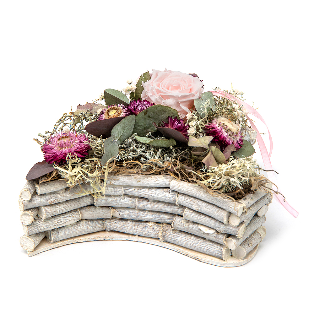Aranžmán v prútenom drevenom srdci s In Eterno ružovou ružou, zeleňou, prírodnými doplnkami, slamienkami a dekoračnou stuhou.