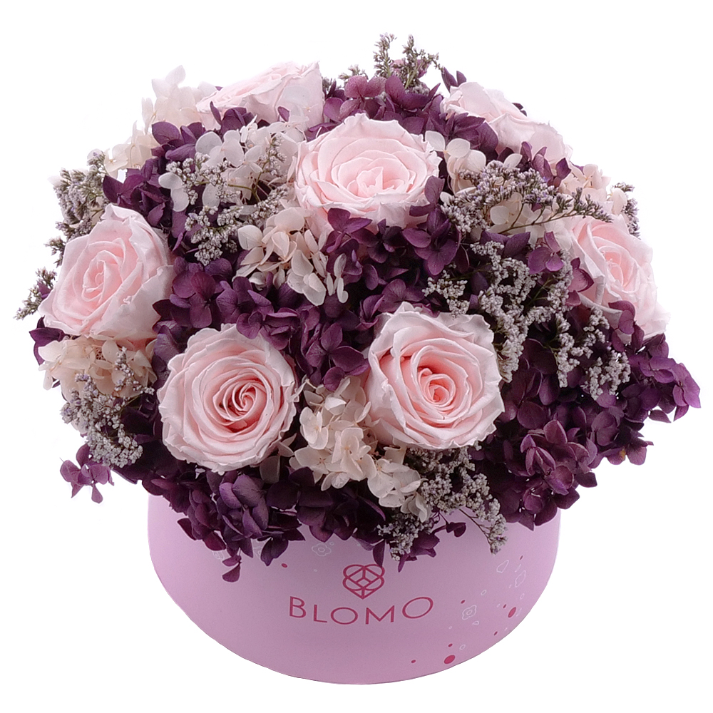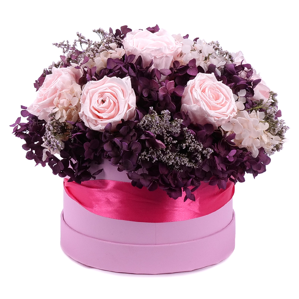 Flower box s In eterno preparovanými večnými ružami, preparovanou hortenziou, prírodnými materiálmi v jemnej ružovo - fialovej kombinácii. Vhodný darček na skrášlenie bytu, domu alebo k sviatku narodenín a menín.