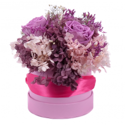 Flower box ružovej farby s preparovanou hortenziou v ružových odtieňoch a In eterno večnými ružami, ktoré nevädnú. Vhodný darček pre Vašich drahých alebo aj pre Vás len tak pre potešenie a skrášlenie domu či bytu.