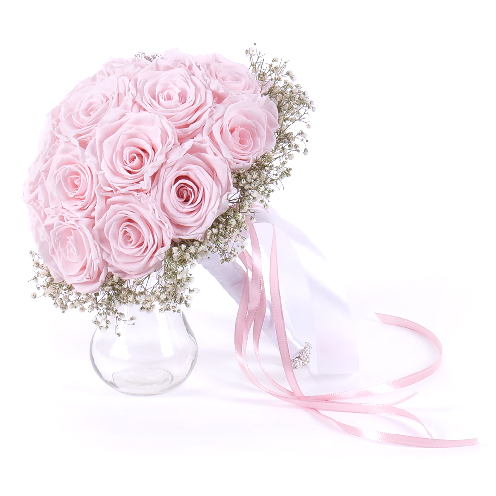 Svadobná kytica pre nevestu zo 17 jemných ružových ruží ozdobená gypsomilou a dvojicou saténových stúh. ... Viac