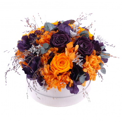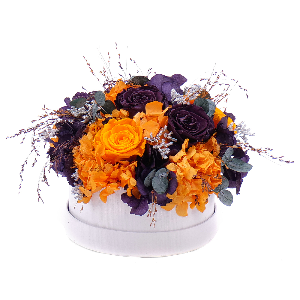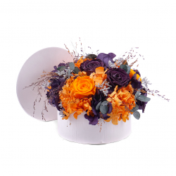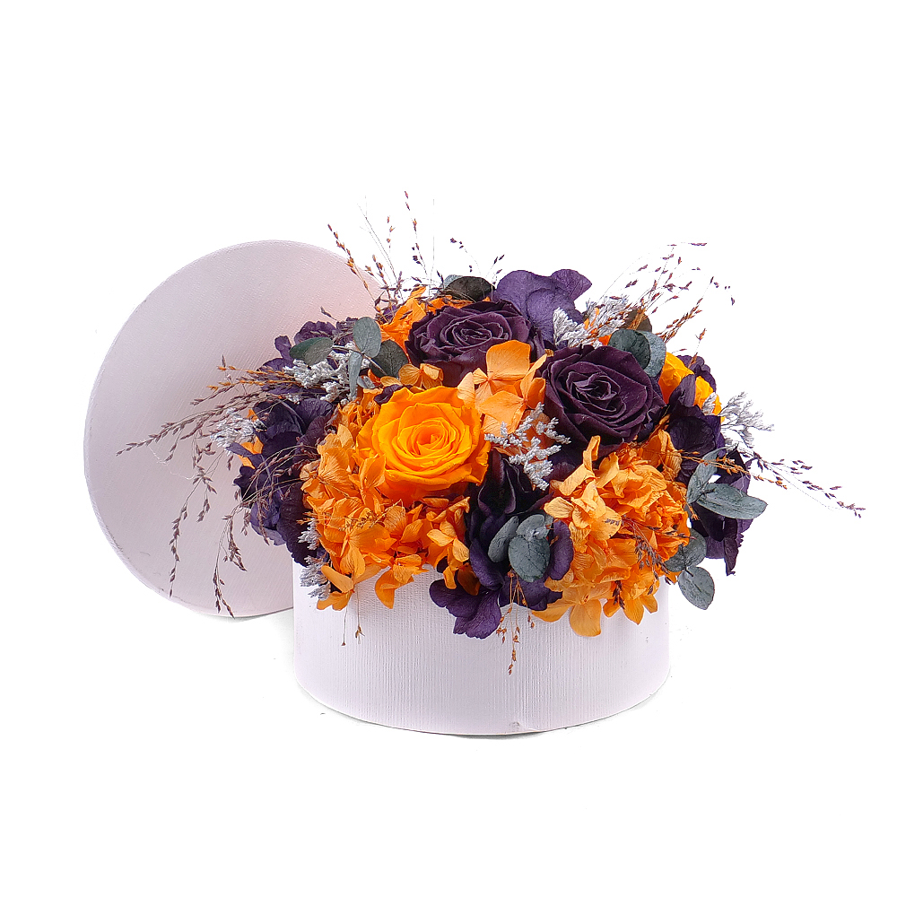 Okrúhly flower box s In eterno preparovanými kvetmi s prírodnými doplnkami.