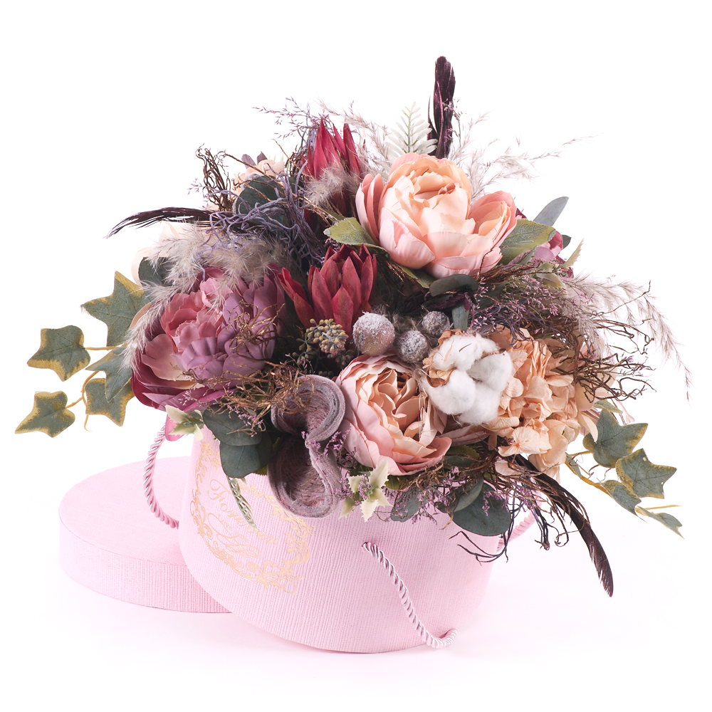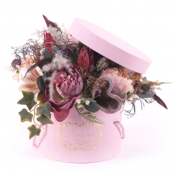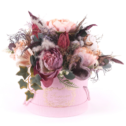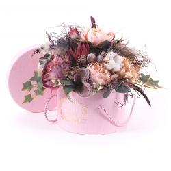 V boxe jemnej ružovej farby sú aranžované kvety protey, pivónií, hortenzie, ľalií doplnené listami eukalyptu, brečtanu a dekoračnej zelene. Jemnosť aranžmánu dodáva plod bavlny.