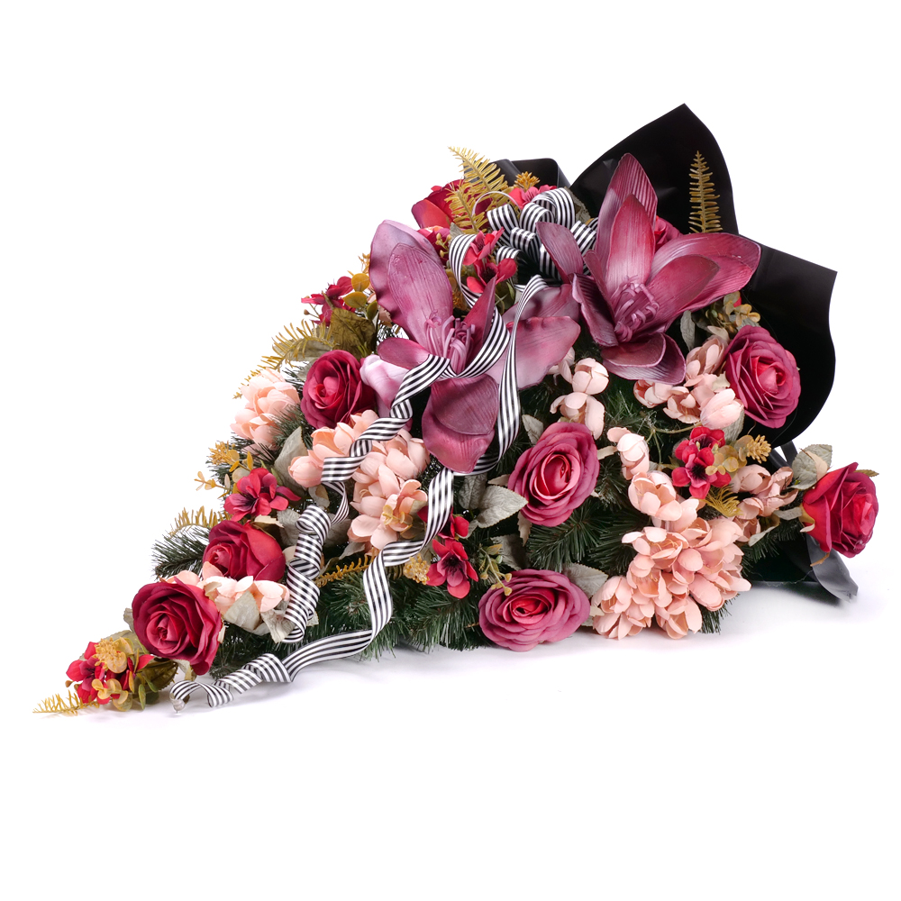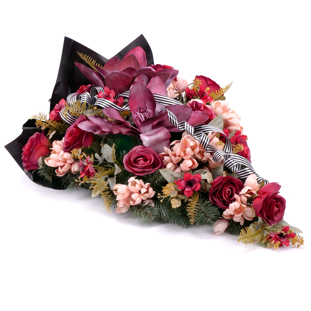 Smútočná kytica z umelých a penových kvetov bordovej, marhuľovej a červenej farby. Podklad aranžmánu tvorí základ z umelej čačiny. Súčasťou je smútočný dekoračný papier a stuha.