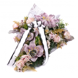 Smútočná kytica z umelých a penových kvetov v jemnej ružovo - fialovej farbe. Základ kytice tvorí podklad z umelej čačiny. Kytica je doplnená smútočným papierom a stuhou.