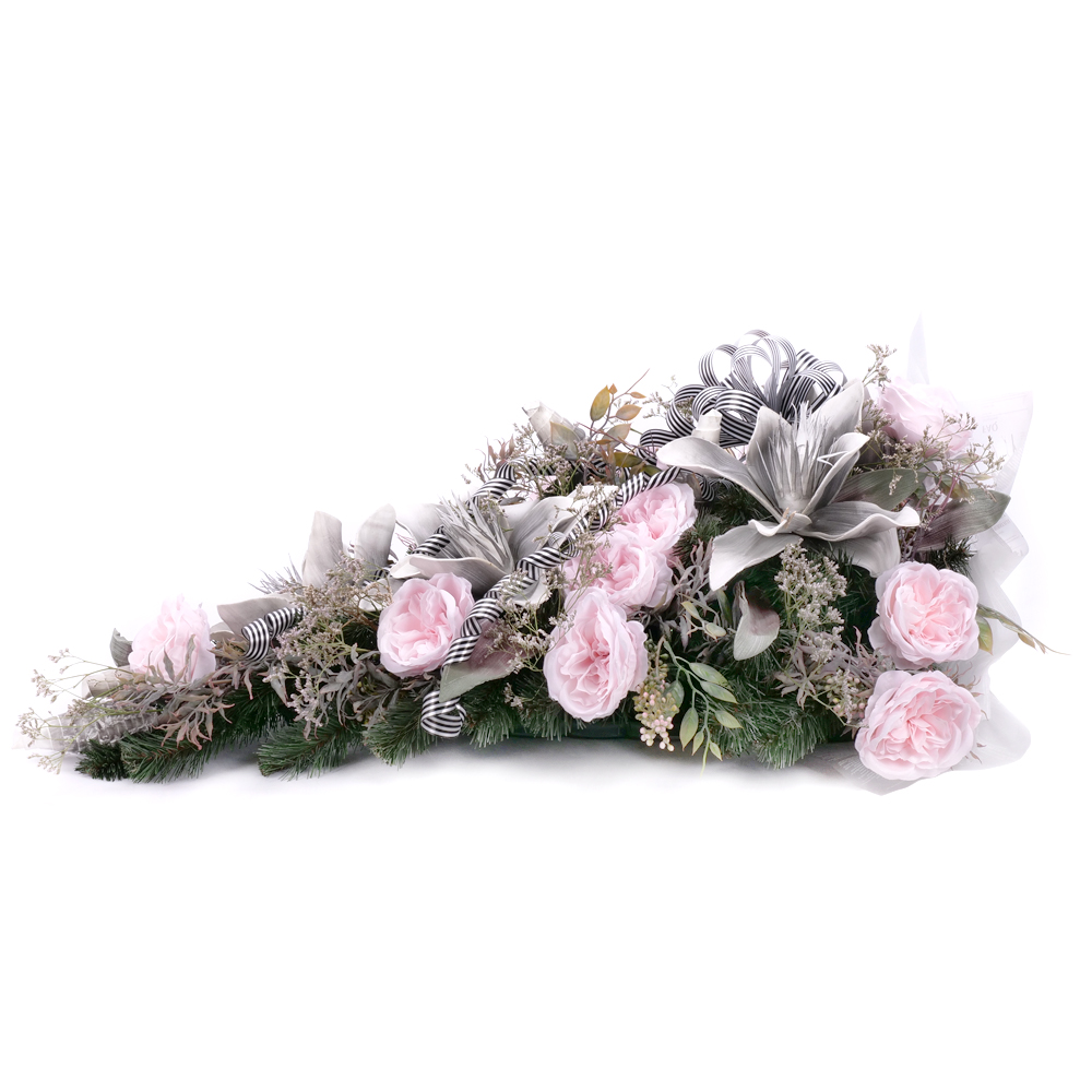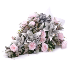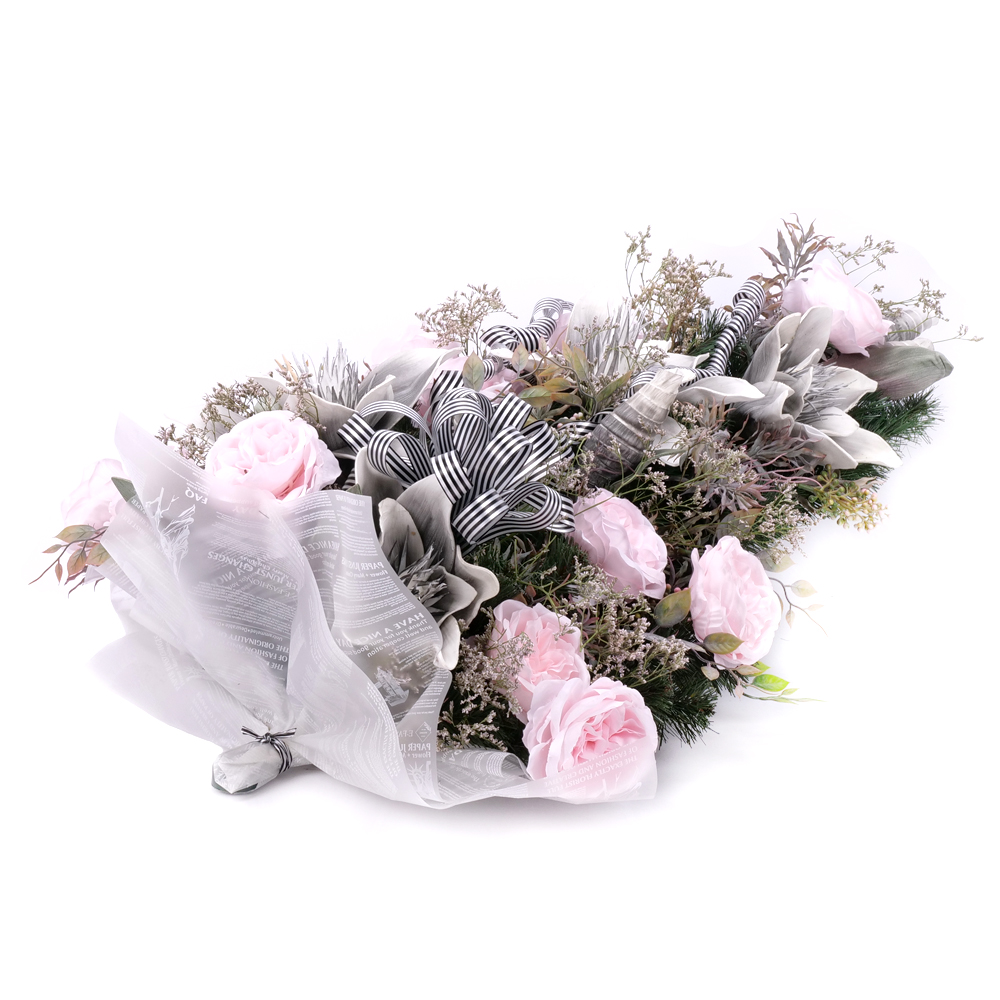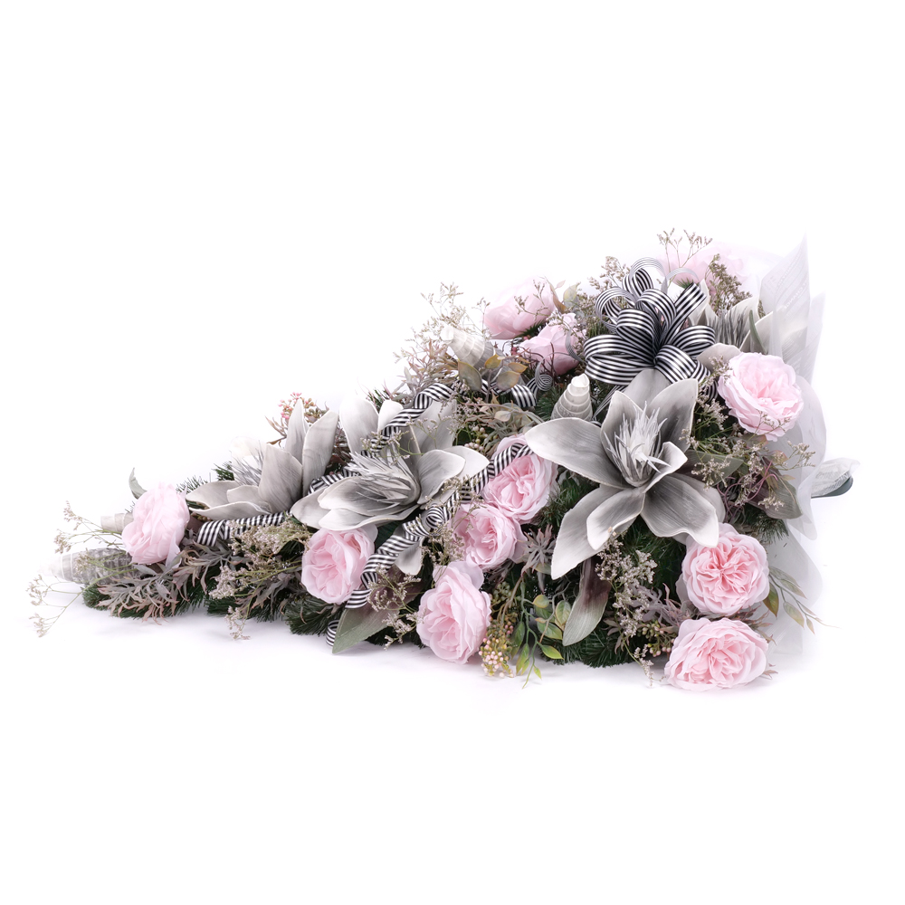 Smútočná kytica z umelých a penových kvetov šedej a ružovej farby. Základ kytice tvorí umelá čačiny. Súčasťou kytice je smútočná dekoračná stuha.