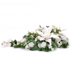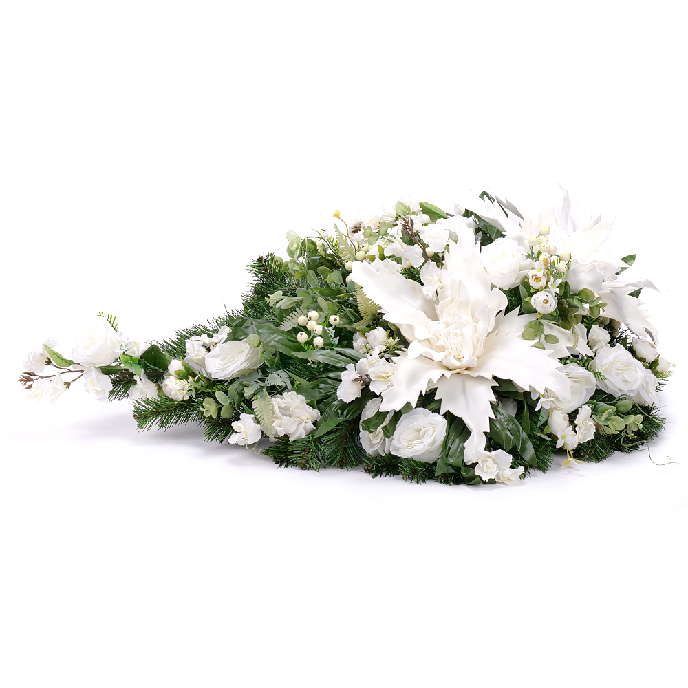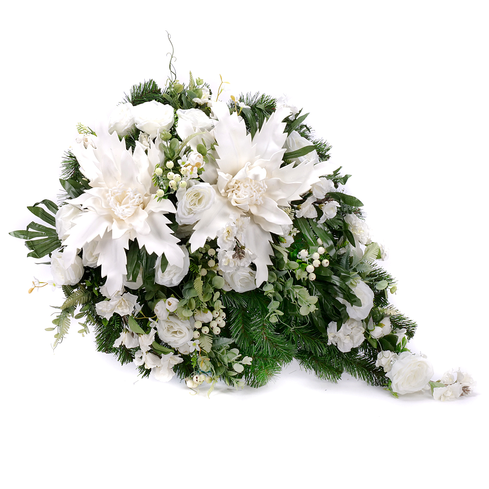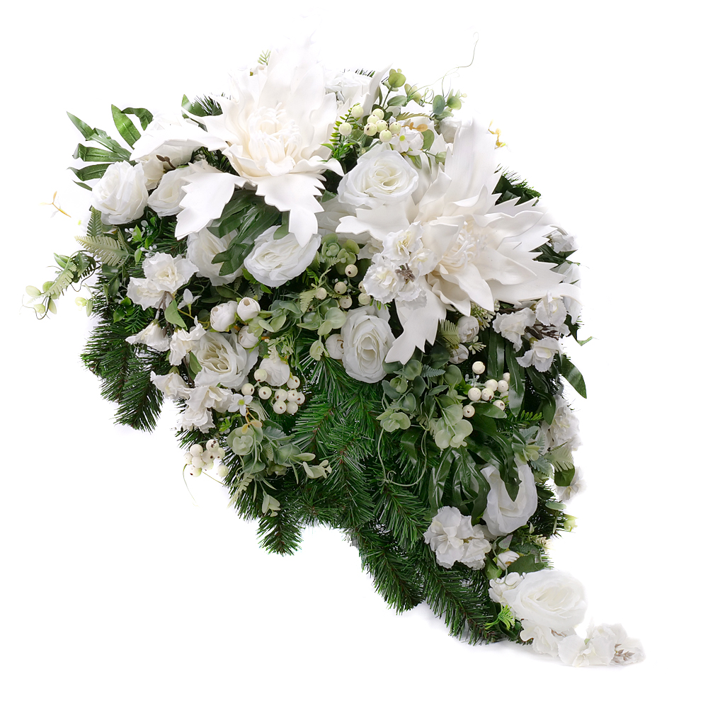 Smútočný umelý aranžmán v tvare slzy z bielych umelých a penových kvetov bielej farby. Podklad aranžmánu tvorí umelá čačina.